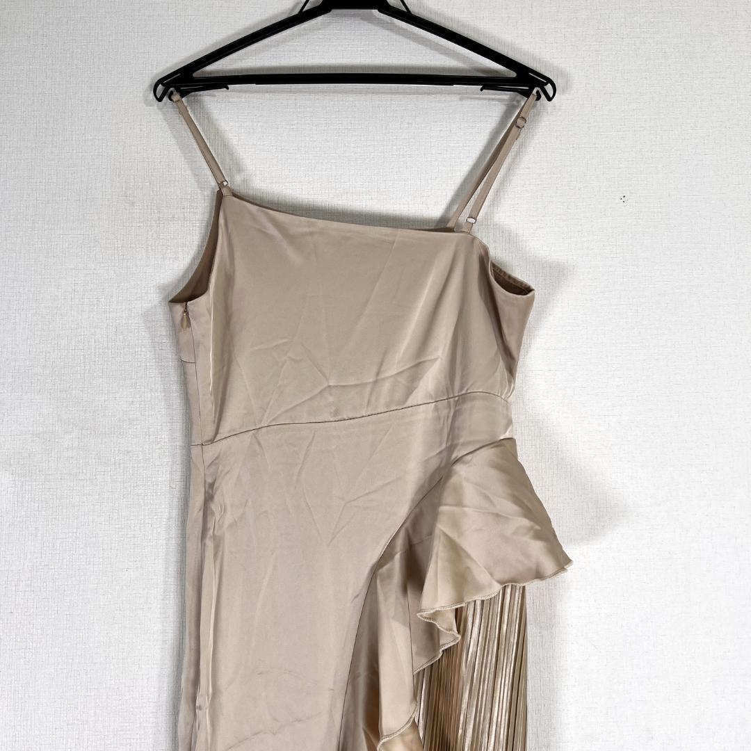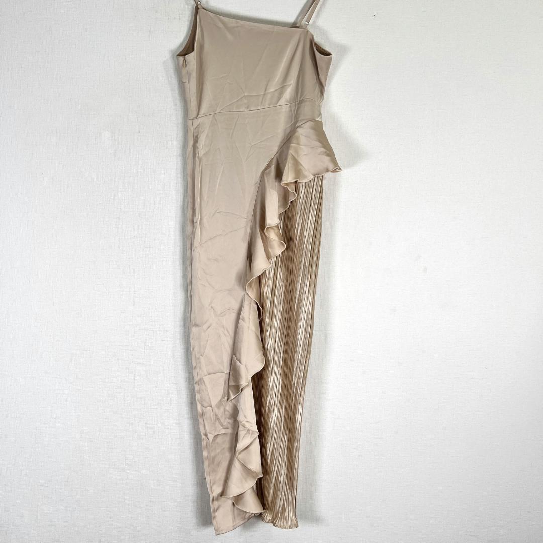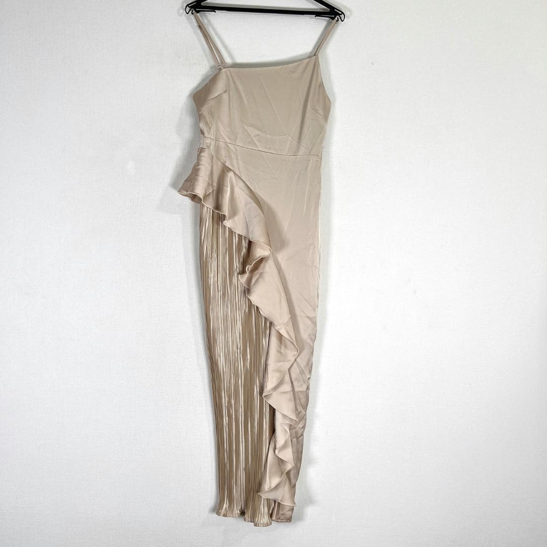 女性用のベージュ系サテン調フリルワンピース ドレスワンピース キャバドレス キャミワンピース 袖なしロングワンピースです。新品タグ付きの未使用品です。