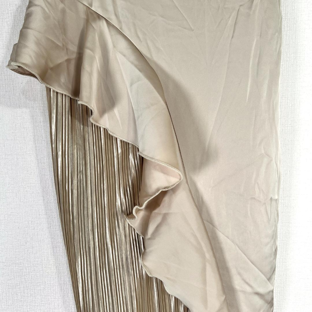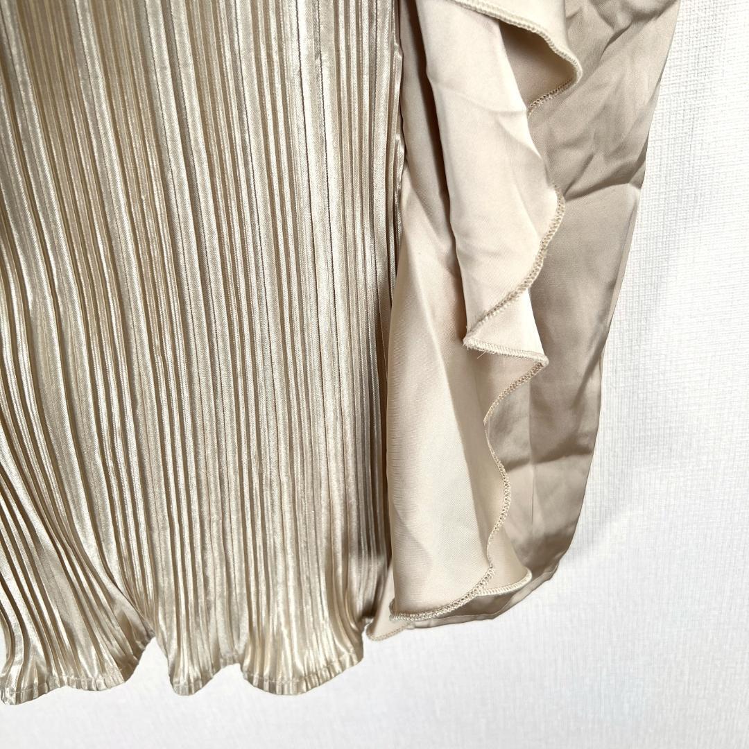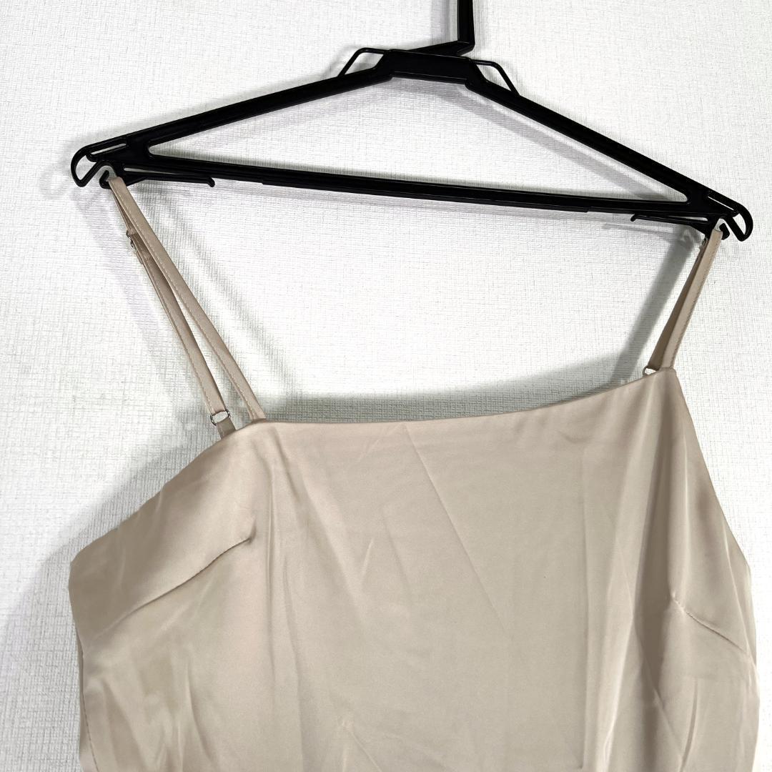 女性用のベージュ系サテン調フリルワンピース ドレスワンピース キャバドレス キャミワンピース 袖なしロングワンピースです。新品タグ付きの未使用品です。