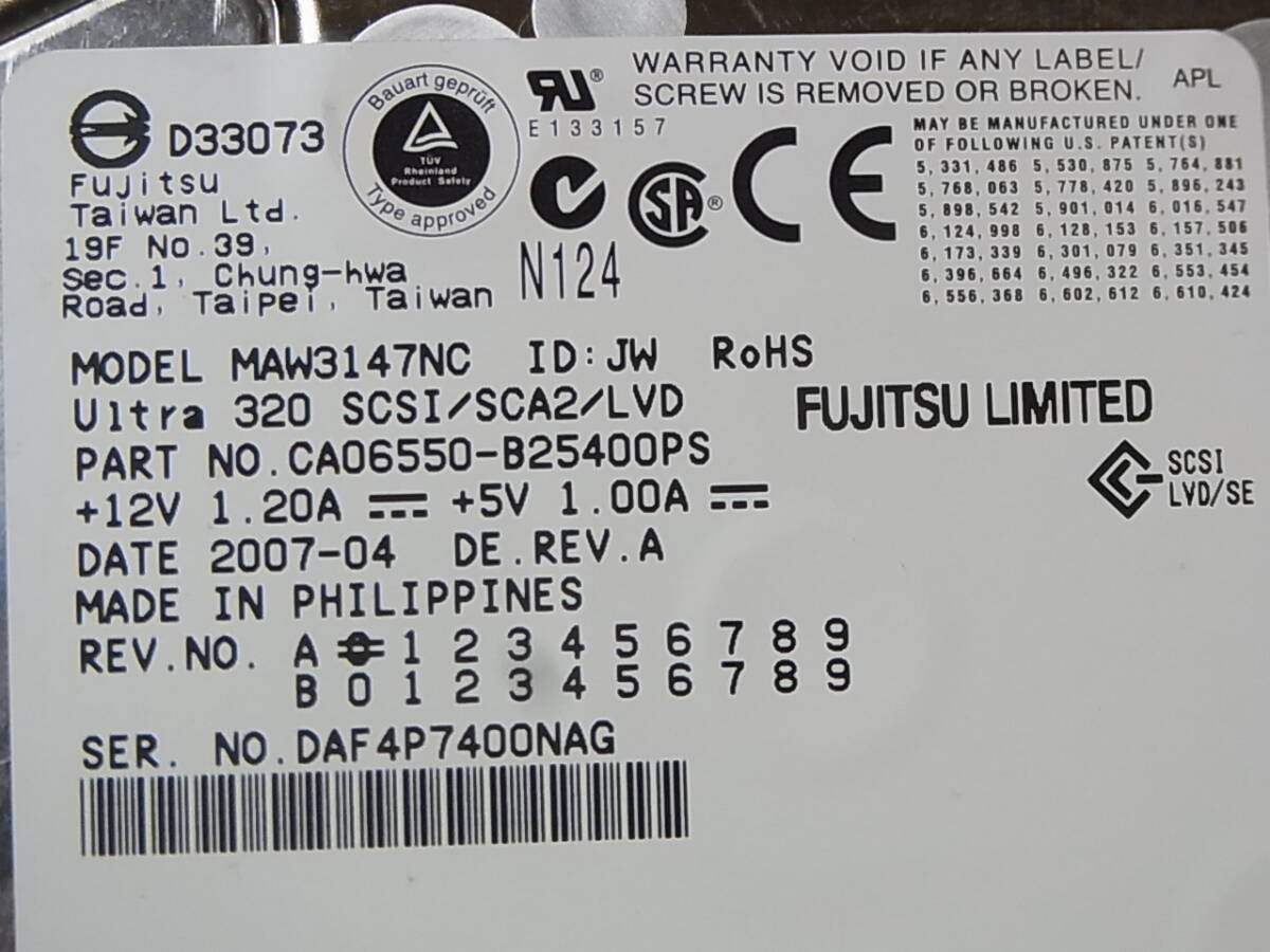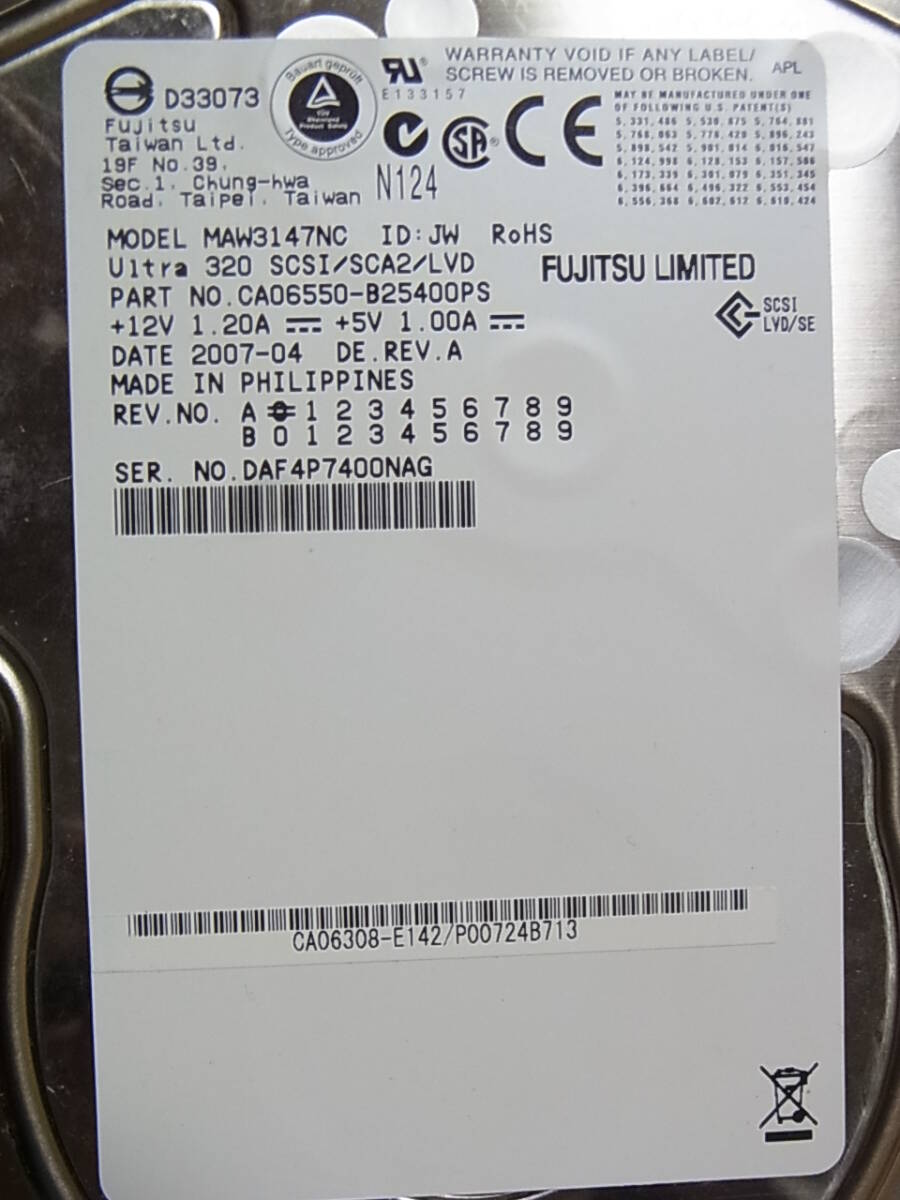 Fujitsu MAW3147NC 147G/10K/Ultra320 SCSI/SCA 3.5インチ HDD です。