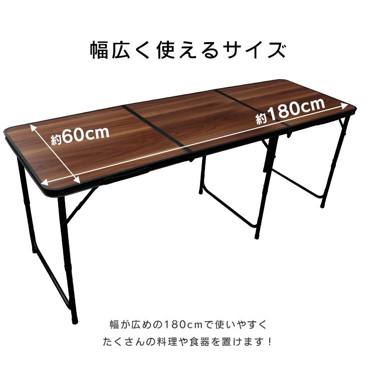 車のトランクに入れる時や持ち運びの際にもとても便利な取っ手付きで持ち運びもラクラク!! サビに強いアルミを使用。 天板には防水加工が施されています。 テーブルは3段階の高さ調節ができ、お好みのスタイルに合わせて「ハイスタイル」「ロースタイル」の2パターンでお使いいただけます。 キャンプ、バーベキュー、お花見などにとても便利。 気軽にアウトドアレジャーをお楽しみいただけます!! 【商品仕様】 折りたたみ式 テーブルサイズ(約):幅180cm×奥行60cm×高さ55cm/62cm/70cm ※高さ3段階調節 カラー:ダークウォルナット 収納サイズ(約):幅62cm×奥行10cm×高さ62cm 耐荷重(約):20kg 重量(約):7.2kg 材質:アルミ、MDF(耐熱・耐水加工)、ポリエステル、スチール 【注意事項】 ・初めてご使用の場合、耐久性を高めるために天板がフラットにならず山なりになっております。 適度な力で上から押していただくと改善されますので、お試しください。初期不良ではございません。 ・海外製品で、簡易梱包での輸入のため風防に擦れや多少の小キズなどがある場合がございますが、商品自体には問題ありませんのでご了承下さい。 ・商品は、モニターによって色合いが異なって見える場合があります。 ・仕様・デザインは改良のため予告なく変更することがあります。 【その他ラインナップ】 ・70cm ・90cm(ベンチ付き) ・90cm(4色選択・ベンチなし) ・120cm(イス付き) ・120cm(4色選択・イスなし) ・135cm(BBQタイプ) ・180cm(4色選択・イスなし) ・240cm(4色選択・イスなし) |