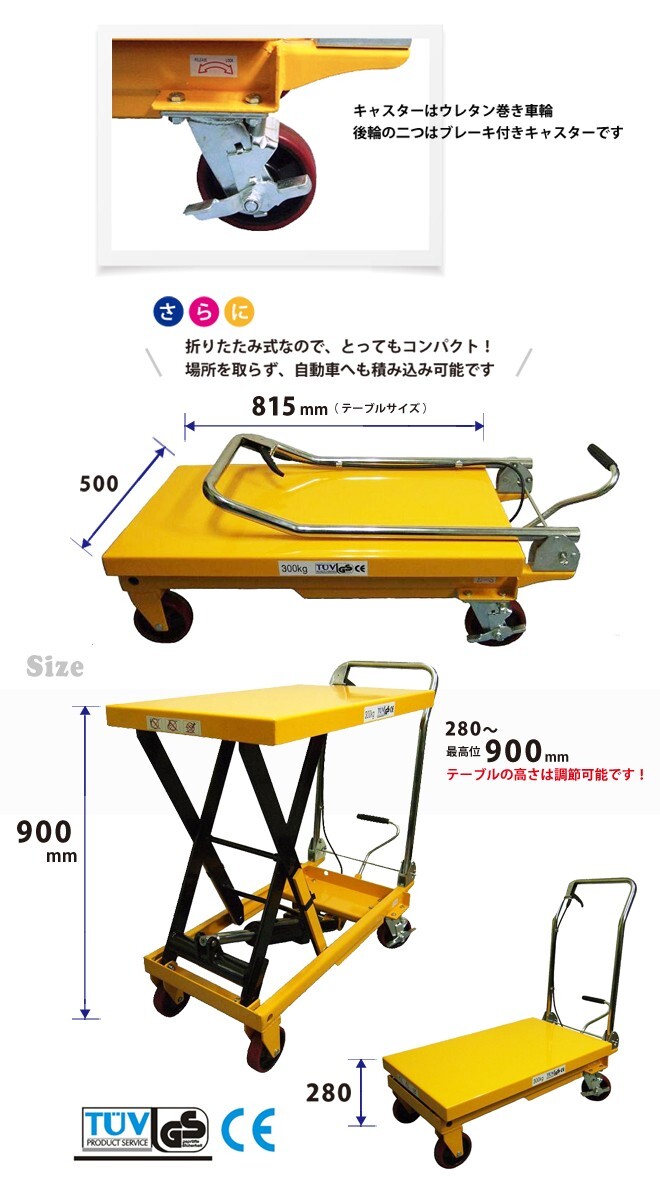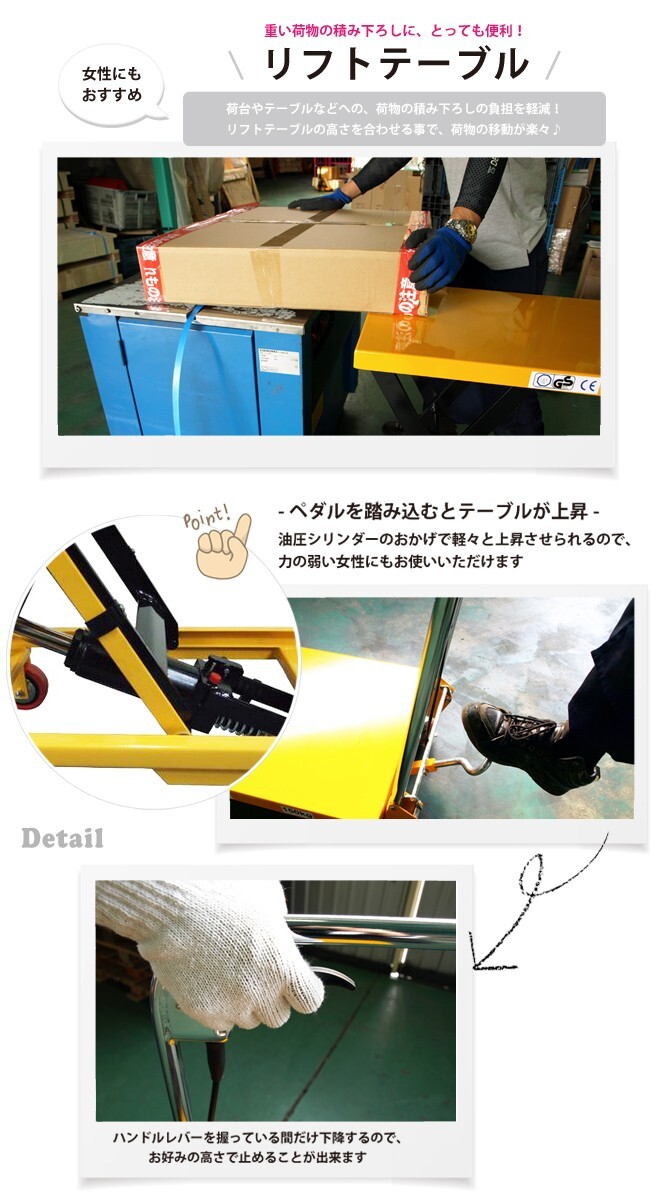 ●さまざまな作業に便利なリフトテーブルです ●300kgまでの荷物を油圧シリンダーで軽々と上昇させます ●ハンドルは折りたたみ式で場所を取らず自動車へも積み込めます ●ウレタン巻き車輪は静かに転がり、樹脂床にも優しく傷付きの心配が有りません ●ペダルポンプを踏み込むと上昇し、ハンドルレバーを握ると下降します ●1回の踏み込みで約20mm上昇します ●工業製品国際規格GS/TUV/CEマーク全て取得の一級品です ●PL保険付き |