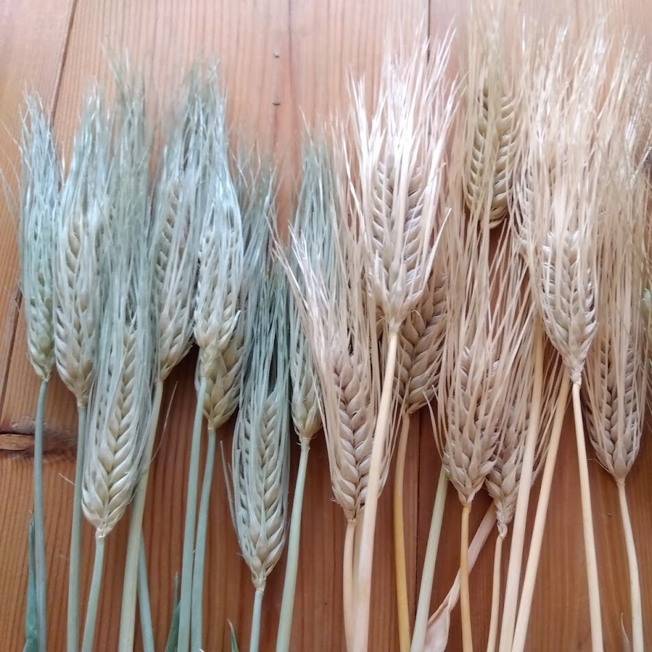 写真3は青麦のドライと完熟穂のドライです。同じ麦でも色違いのドライフラワーができます。