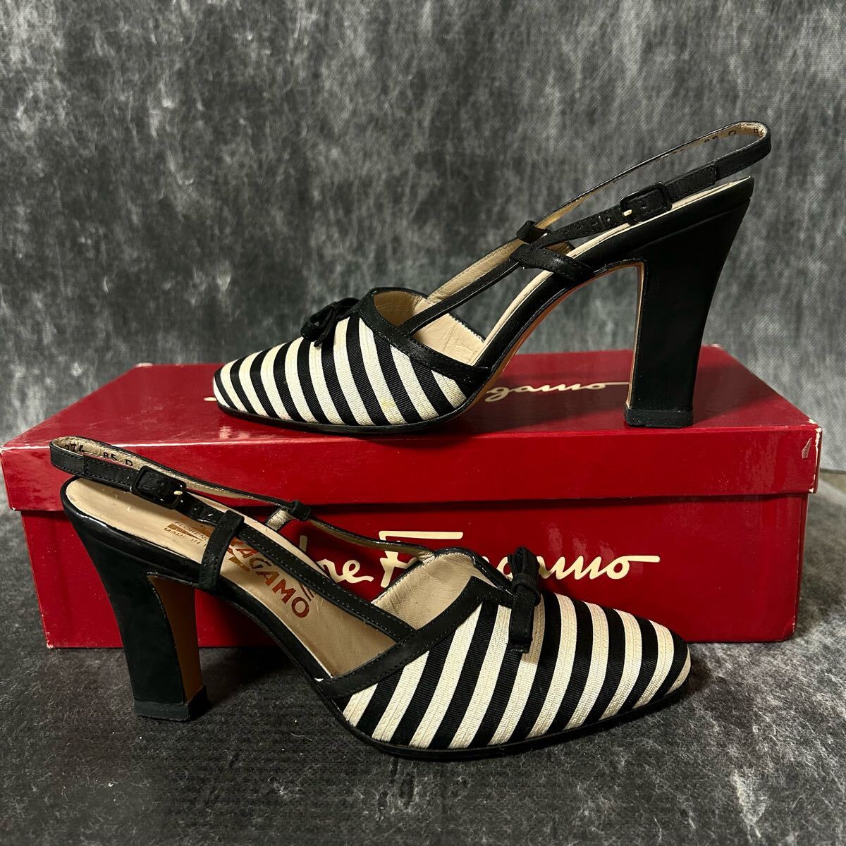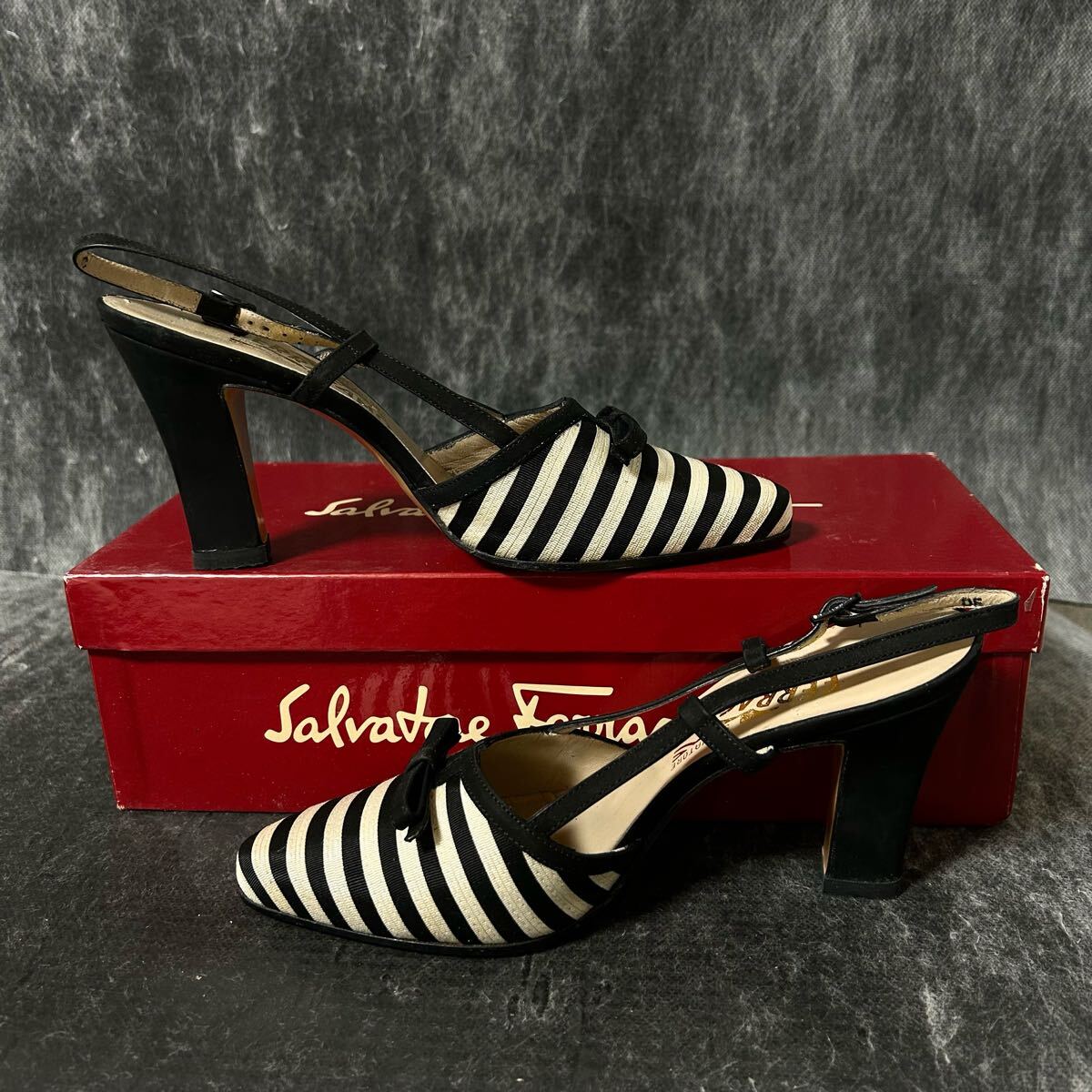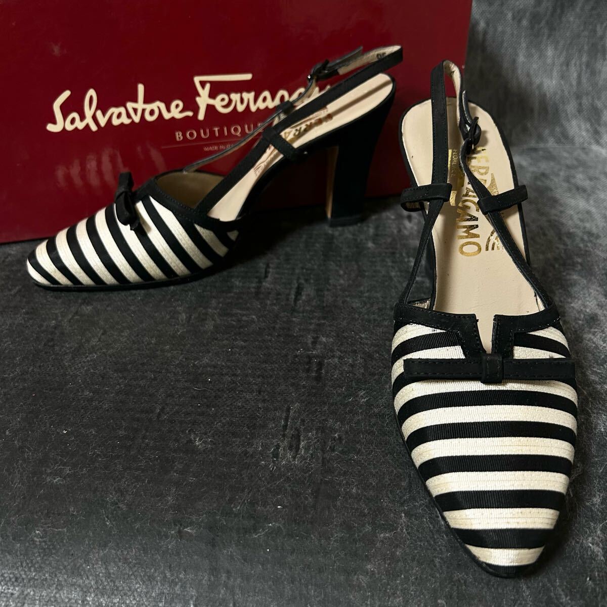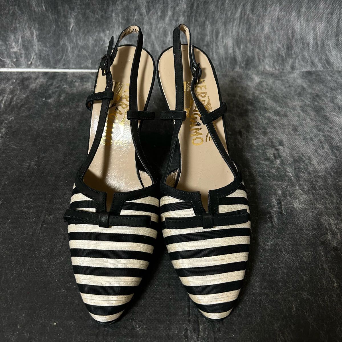【新古品】Salvatore Ferragamo サルバトーレ・フェラガモ ストラップパンプス サンダル ボーダー リボン 51/2C 23cm相当 黒白 ※EO