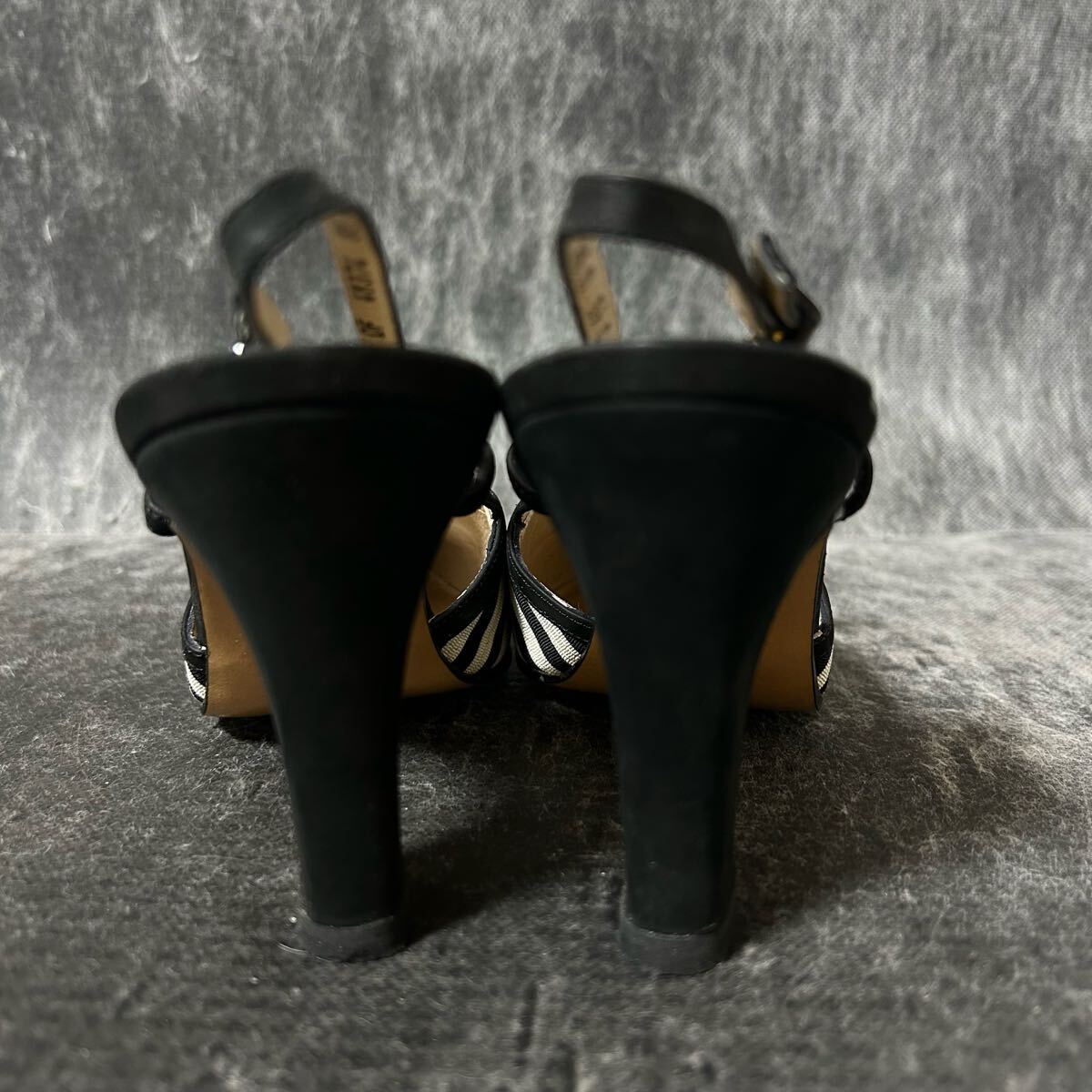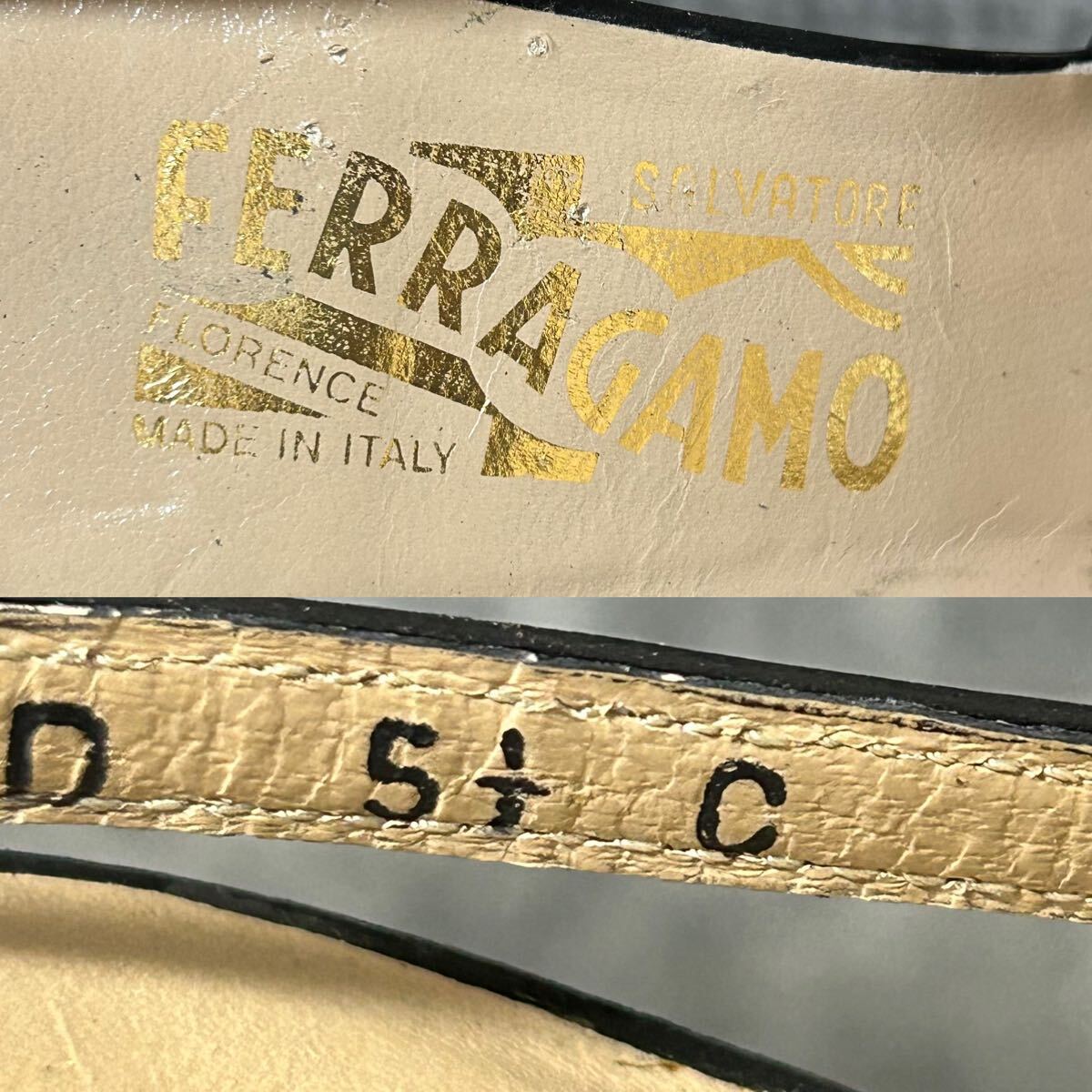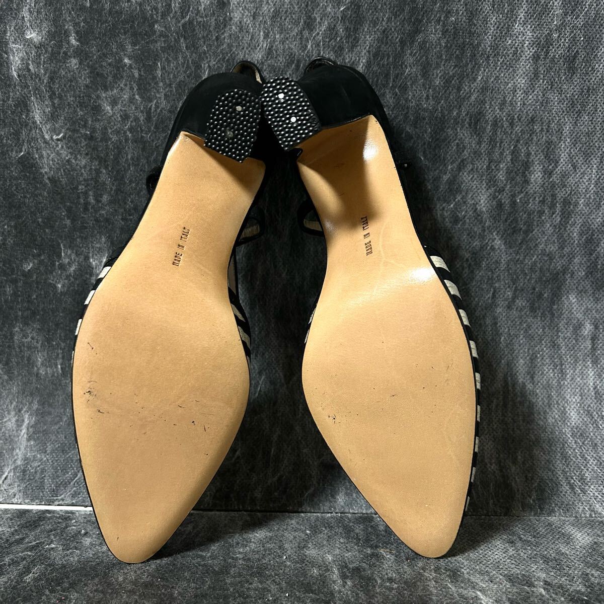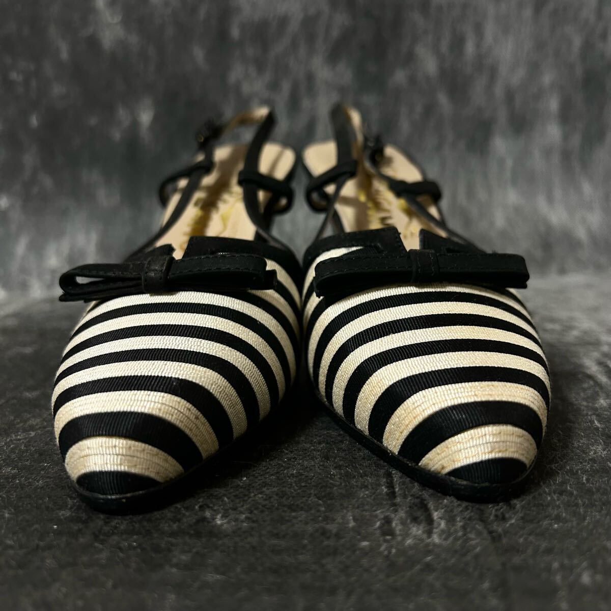 【新古品】Salvatore Ferragamo サルバトーレ・フェラガモ ストラップパンプス サンダル ボーダー リボン 51/2C 23cm相当 黒白 ※EO
