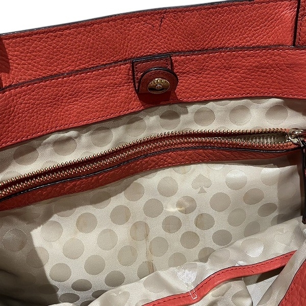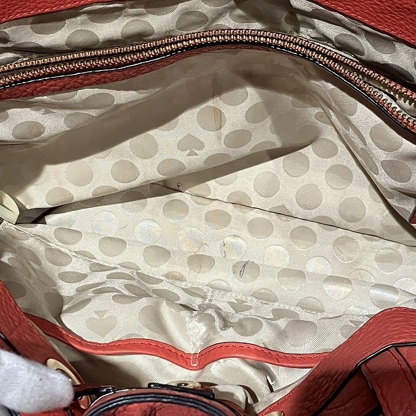 【ブランド】ケイト・スペード 【カラー】オレンジ系 【素材】レザー 【仕様】外側:ポケットなし 内側:オープンポケット×2、ファスナー付ポケット×2 【サイズ】H約26cm×W約38cm×D約14cm ショルダー:約50cm 【付属品】なし 【ランク】B (使用感あり) 【状態】 ショルダー:擦れ、型崩れ、中程度有り 外側の状態:擦れ、角擦れ、傷、型崩れ、中程度有り 内側の状態:汚れ、染み、ペン跡、中程度有り 金具の状態:傷、汚れ、メッキ剥がれ、小程度有り | |