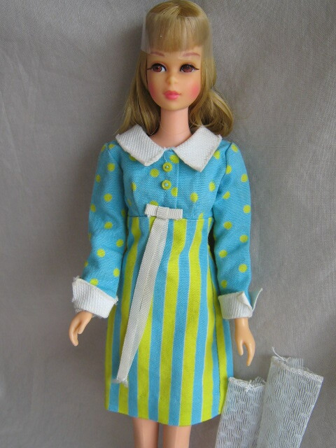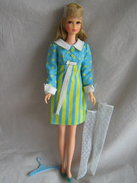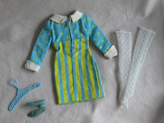 フランシーの初期のお洋服です。ワンピース、レーシーなストッキング、ブルーのソフトなハイヒール、それに、ブルーのフランシー専用レーシーなハンガーも付いたコンプリートセットです。モデルの人形は含まれません。