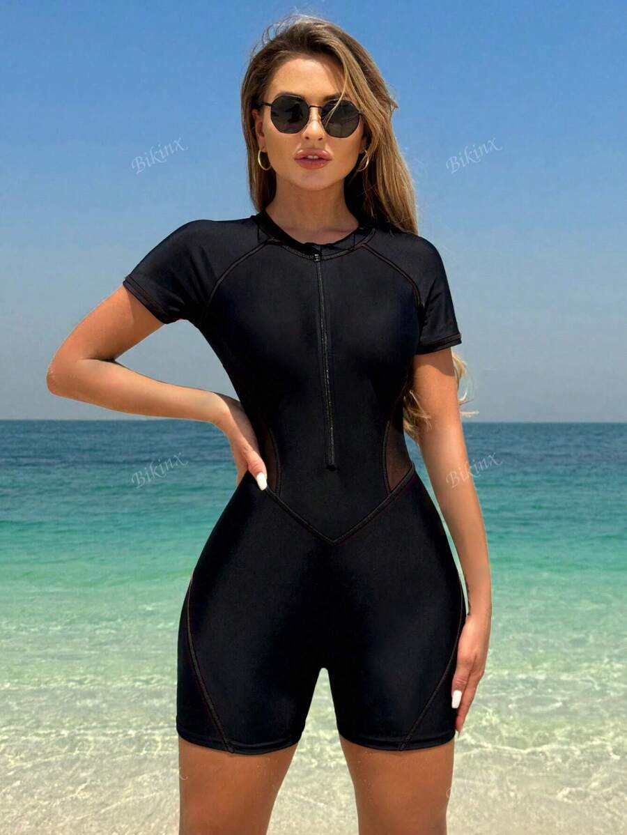 レディース 水着 ワンピース 無地 薄いエッジ スプリット メッシュ 半袖 4隅スポーツワンピース 水着 ビーチバケーション用