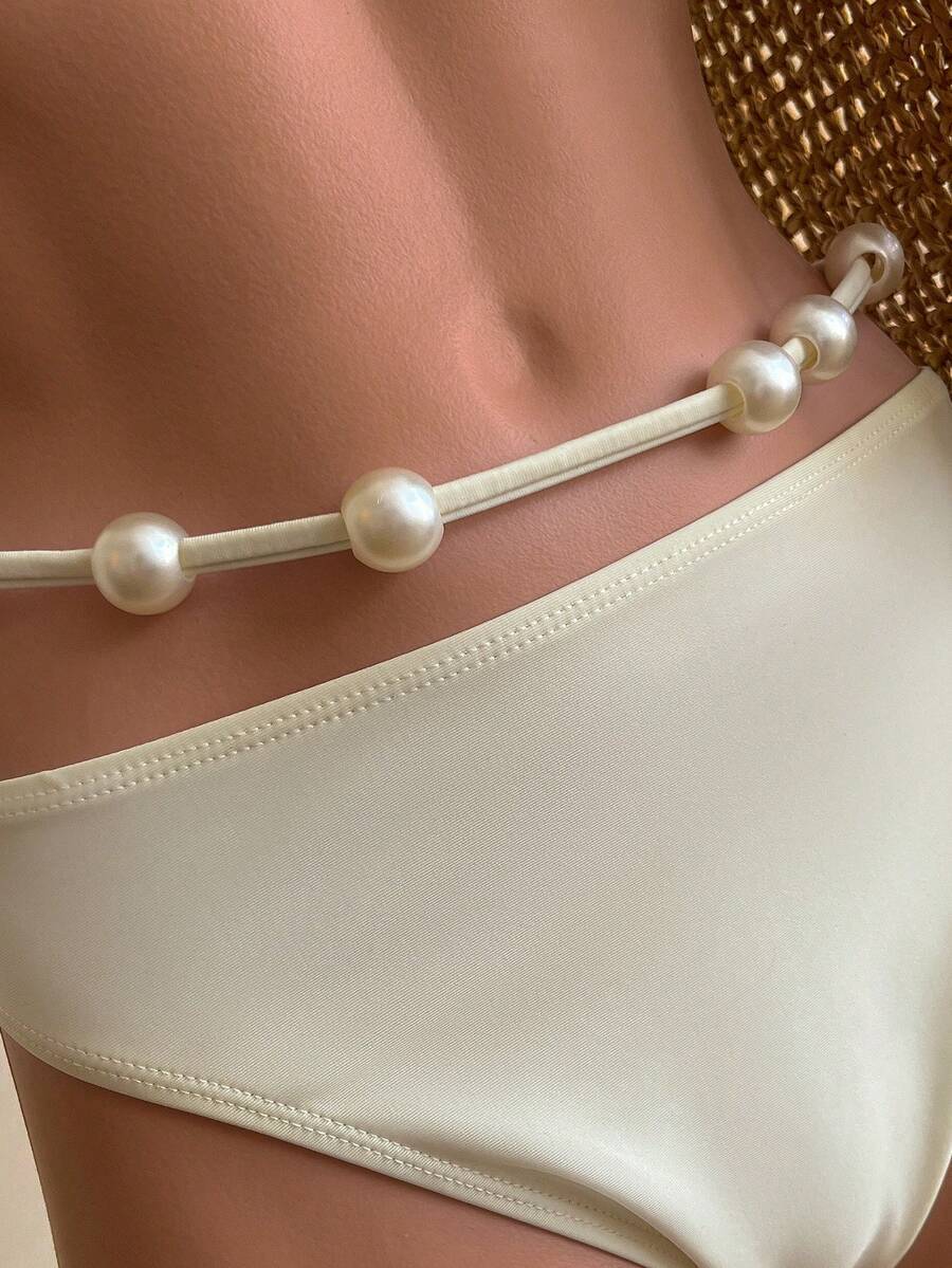レディース 水着 ビキニセット ソリッドカラー ホルターネック パール クロップトップ ビキニ
