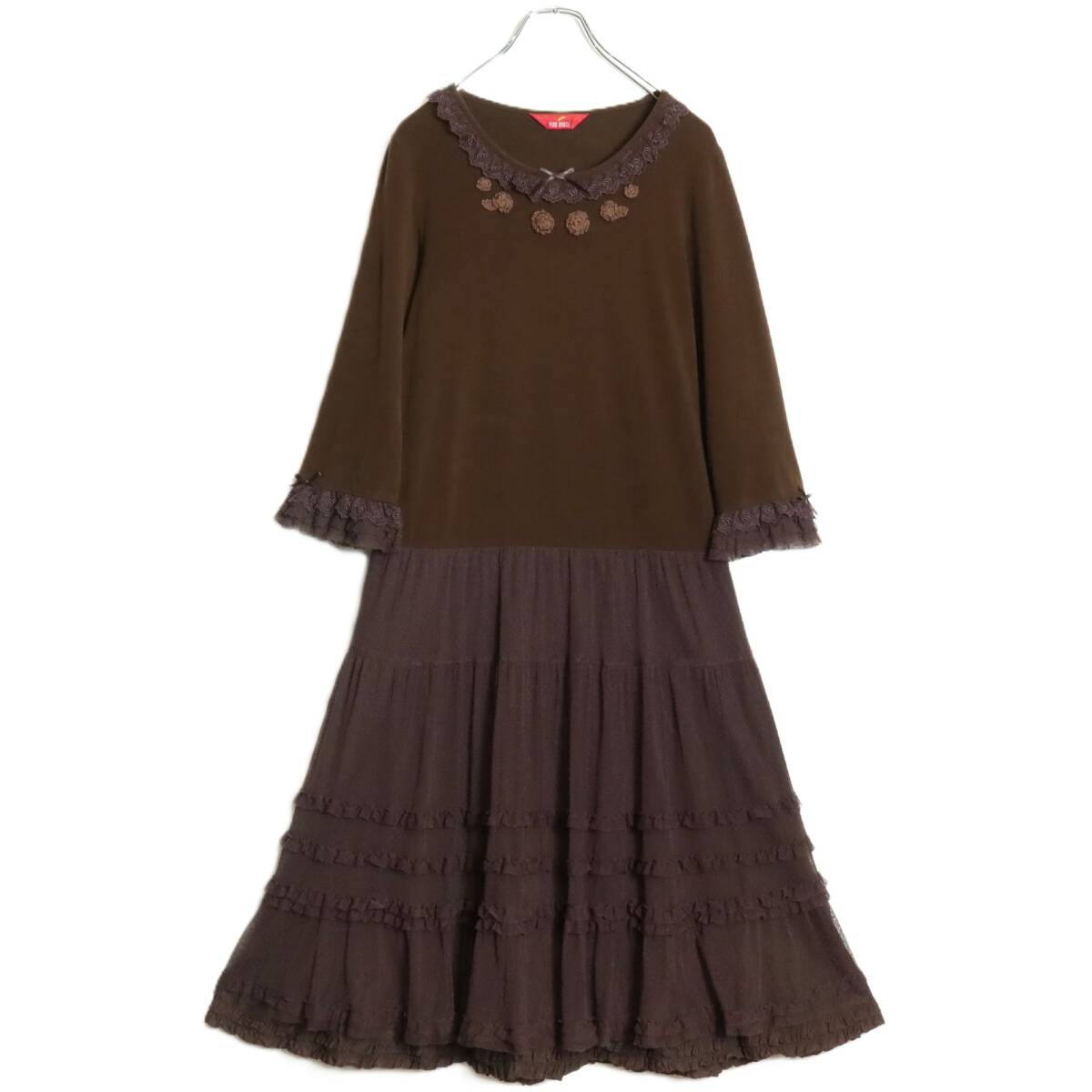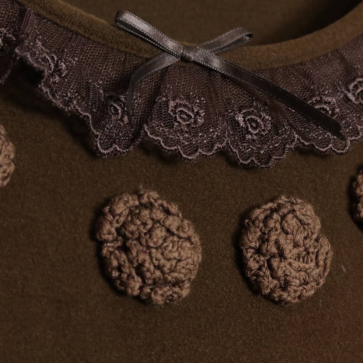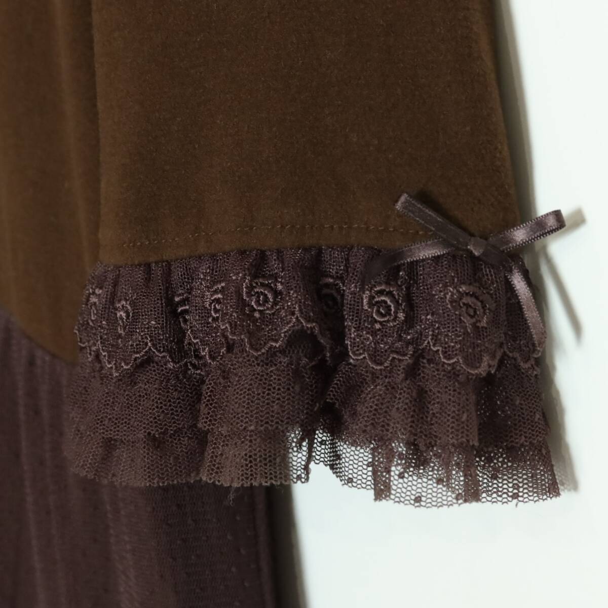 商品説明 | 【実寸約】肩幅38袖丈48バスト88着丈109(cm) 【サイズ表記】 なし。実寸をご参照くださいませ。 【素材】 アクリル57レーヨン38ポリウレタン5% 【状態】普通の使用感のあるお品物 【デザイン】ブラウン系 上半身はカットソー、スカートはドット付きチュールレースのドッキングワンピースです。 襟ぐりと袖口にはローズ刺繍付きチュールレースがほどこされ、サテンのミニリボンも付いています♪ 裾は綿ローンとチュールレースの段々フリル♪ フロントにはお花のニットモチーフまでついた手の込んだ一枚です。 スカート部分は綿ローンの裏地付き♪ これ一枚でもレイヤードでもロマンティックコーデに大活躍するアイテムです。 |