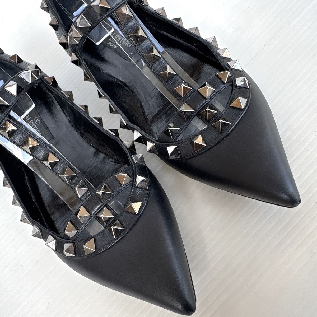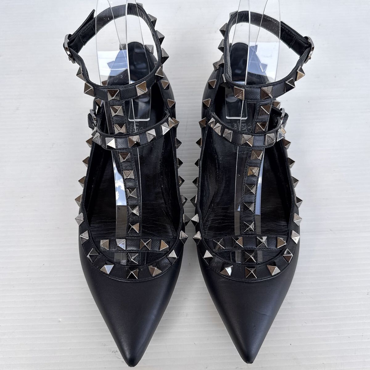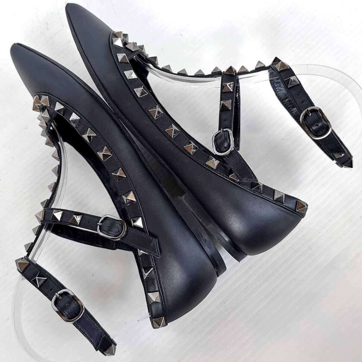 VALENTINO ヴァレンティノ 定番 ロックスタッズ ストラップ付き ポインテッドトゥ サンダル パンプス ローヒール フラットシューズシューズ ミュール イタリア製 正規品 レーディス シューズ 靴