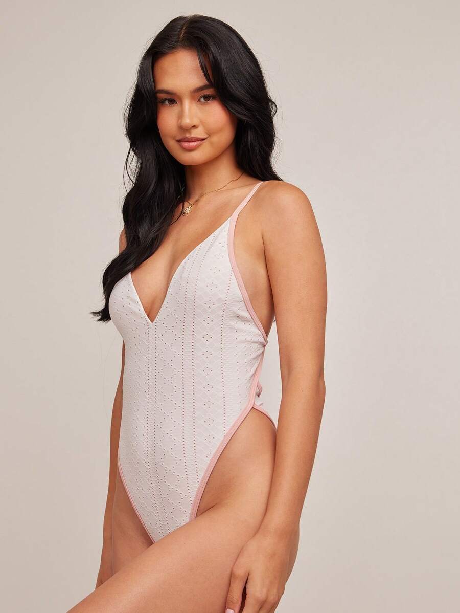 レディース 水着 ワンピース 春 トーンカラーブロック フローラルアイレット スパゲッティストラップ ハイカットレッグ キュートな