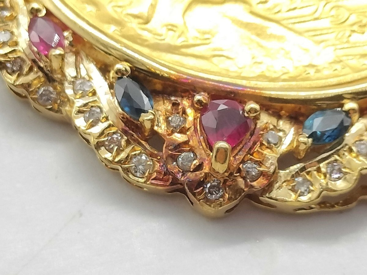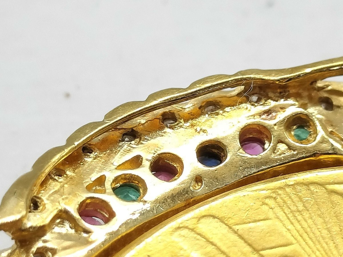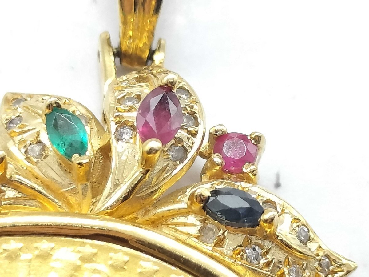 【注意事項】ルビー評価=B(面キズ/面カケあり). サファイア評価=C(面キズ/面カケあり). エメラルド評価=BC(面キズ/面カケあり). ダイヤ評価=BC(TTLB). 地金変色あり. 金貨⇒約33.43g(K21.6). 枠ぐらつきあり