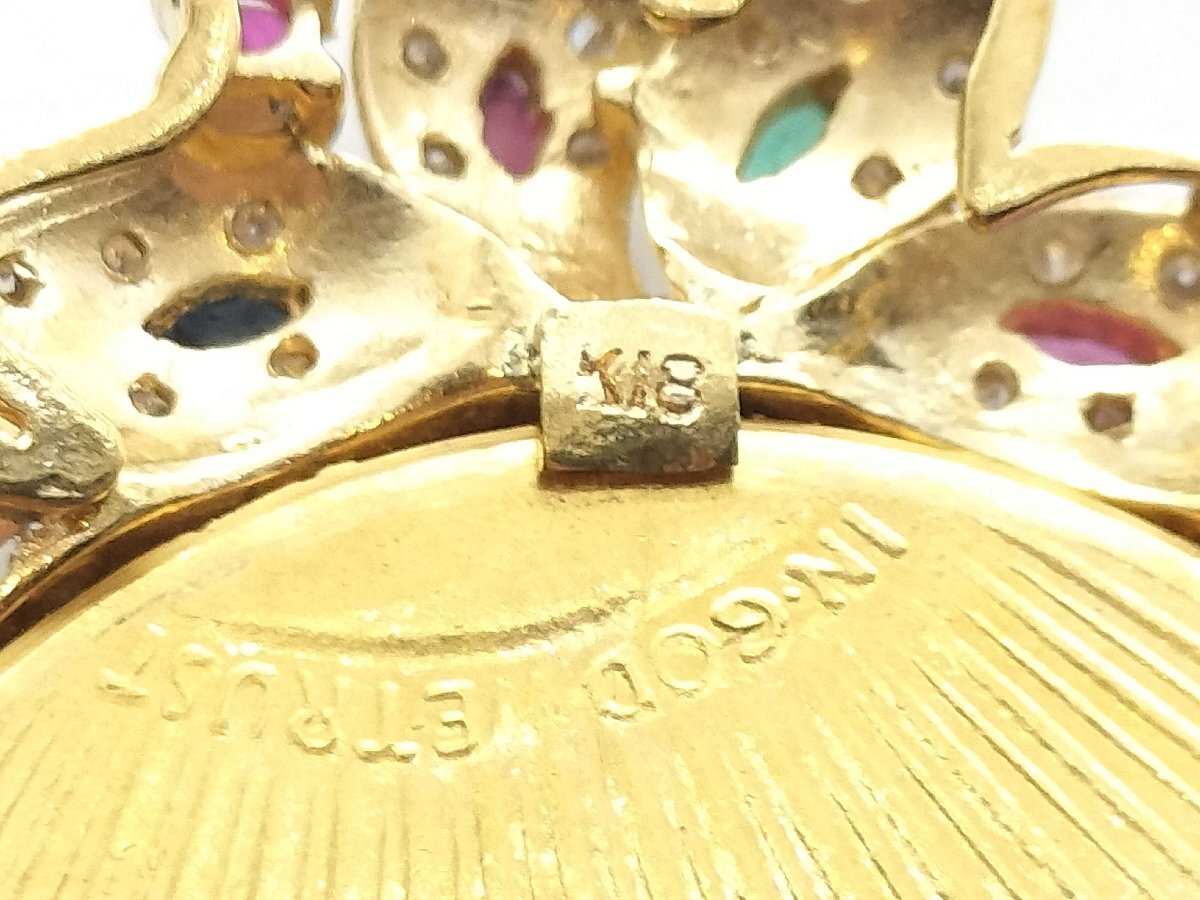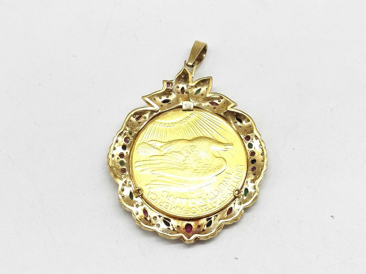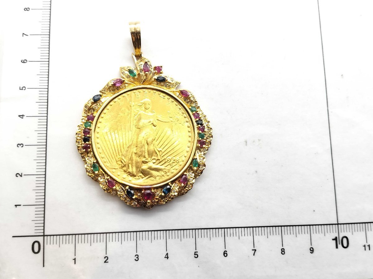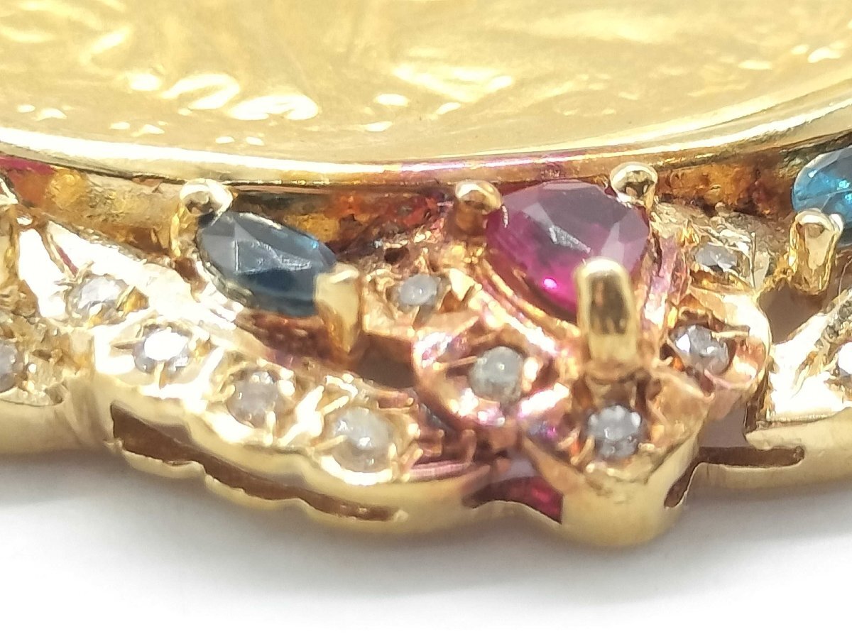 【注意事項】ルビー評価=B(面キズ/面カケあり). サファイア評価=C(面キズ/面カケあり). エメラルド評価=BC(面キズ/面カケあり). ダイヤ評価=BC(TTLB). 地金変色あり. 金貨⇒約33.43g(K21.6). 枠ぐらつきあり