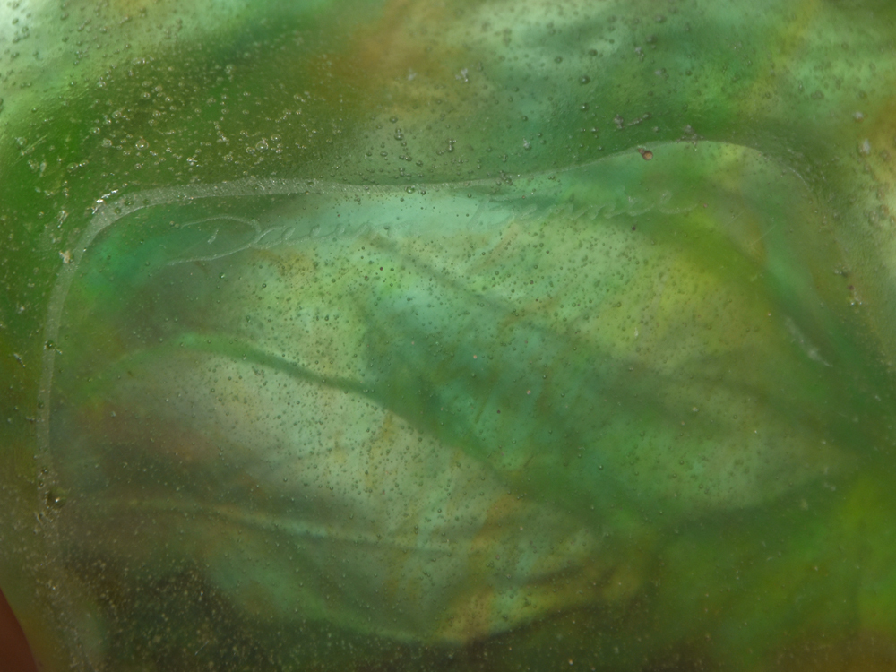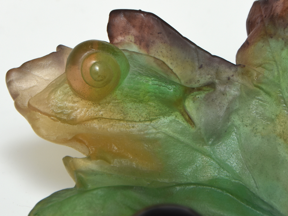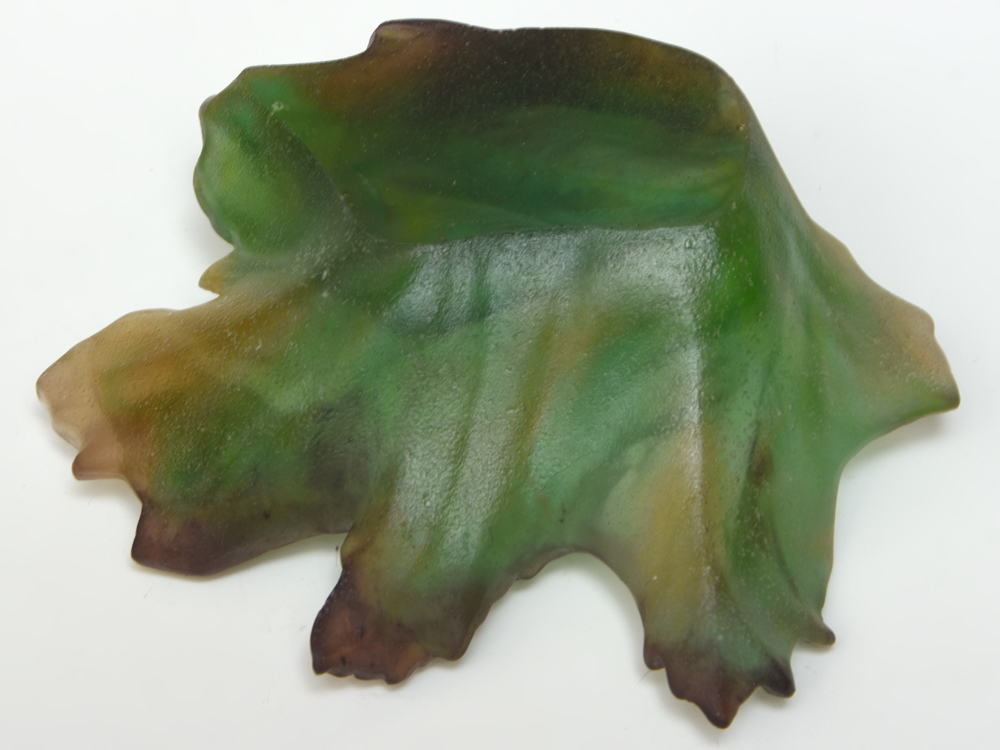 フランスの名門ガラス工芸ブランド、DAUM ドーム社 「カタツムリ」パート・ド・ヴェール製トレイです。 古代メソポタミアで発明されたといわれるガラス工芸の技法パート・ド・ヴェール。 粉砕したガラスを型に詰めて焼成する技法で、柔らかくも緻密な質感と透明感のある発色が特徴です。 ドーム社はこの技法を20世紀初頭に再興させ、アール・ヌーヴォー期の美術工芸を象徴する存在となりました。 本作はカタツムリと葉をモチーフに、淡いグラデーションの中に浮かび上がる美しい意匠となっております。見る角度によって光の陰影が豊かに変化し、空間に華やぎを添えてくれる作品です。 アクセサリートレイや飾り皿としてはもちろん、オブジェとしても空間に華やぎを添えてくれる一品です。 底面には「Daum France」のサインが彫刻されています。 破損なく総じてコンディションは良好です。 ※撮影の際に生じた写り込みなどがございます。 ご理解の程よろしくお願い致します。 |