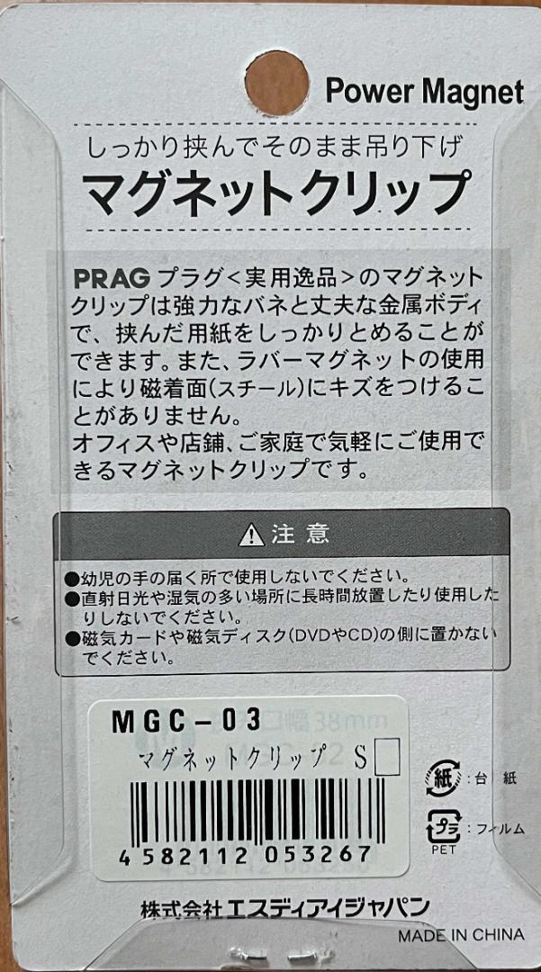 ・金属製の丈夫なボデイ、強力ゴム磁石、強力ばねで確実にはさむ。