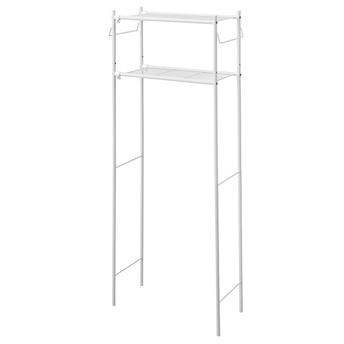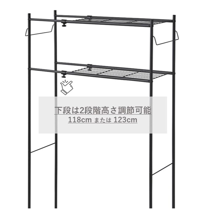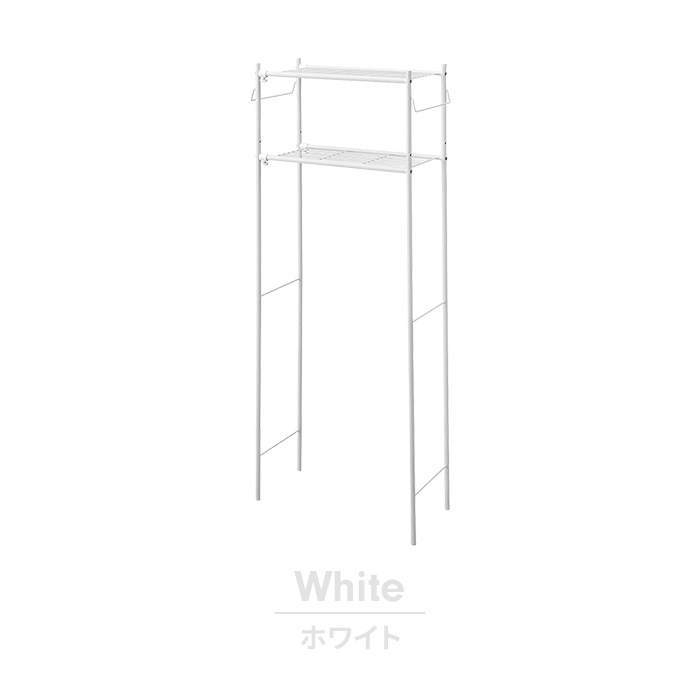 | つやなしマット仕上げ。 スタイリッシュでおしゃれなランドリーラックです。 洗濯機の上のデッドスペースを有効活用します。 サイドに掛けられるタオル掛け2個付。 下段の棚は2段階で高さ調節可能です! |