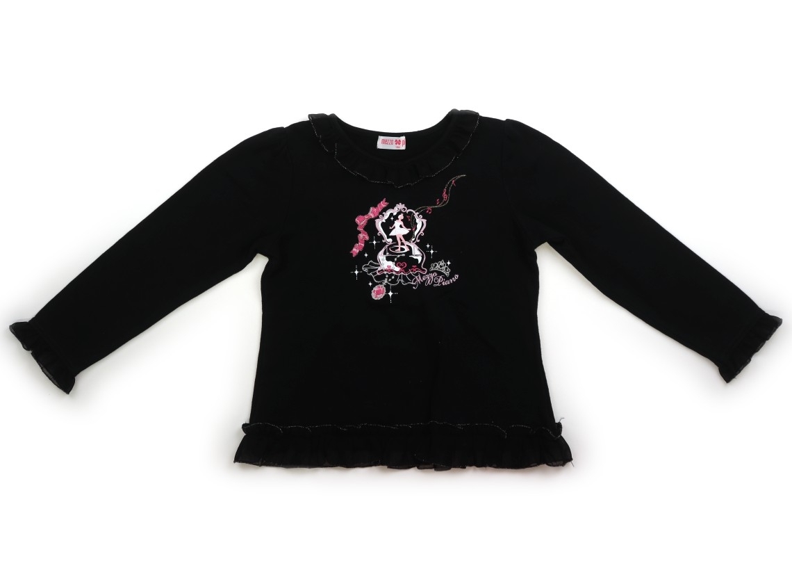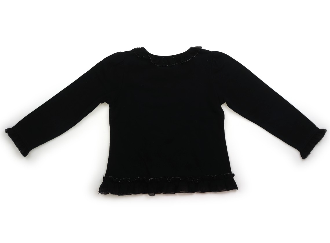 薄手の裏パイルスエット生地です。衿ぐり、袖口、裾にシフォン生地フリルが付いています。前身頃に薄く2cmほどの白っぽい汚れがありますが、まだお使いいただけそうです。