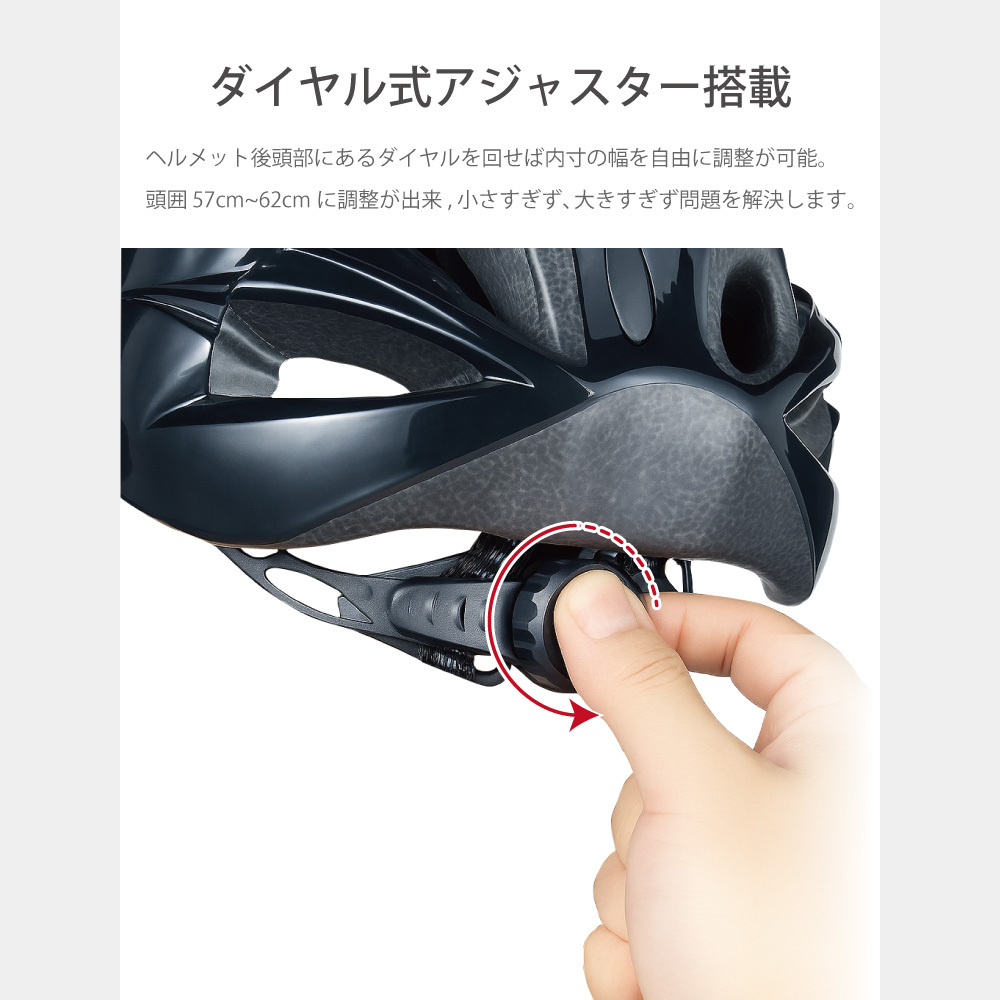 ダイヤル式アジャスター搭載で、頭囲57~62cmに幅広く対応。