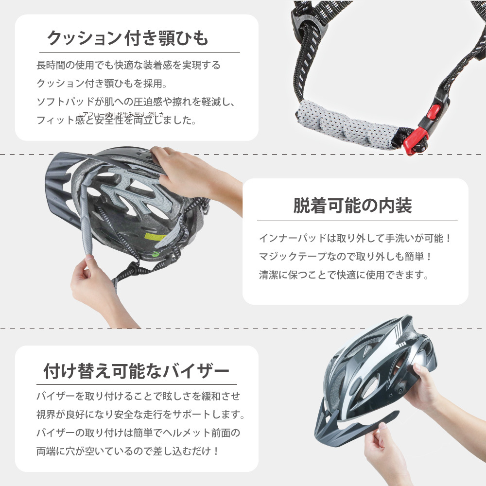 付け替え可能なバイザー:眩しさを和らげ、視界を良好にサポート。簡単に着脱可能。