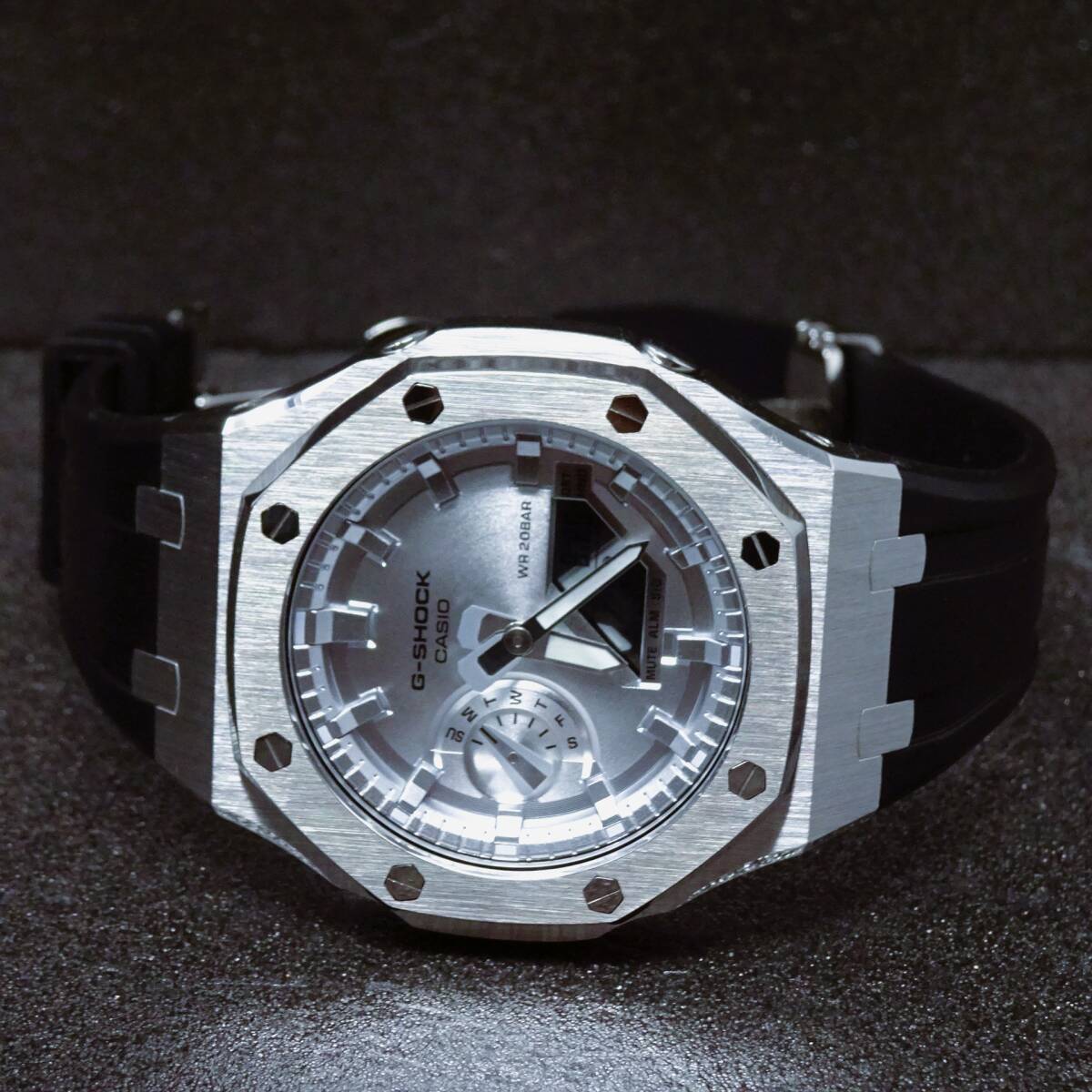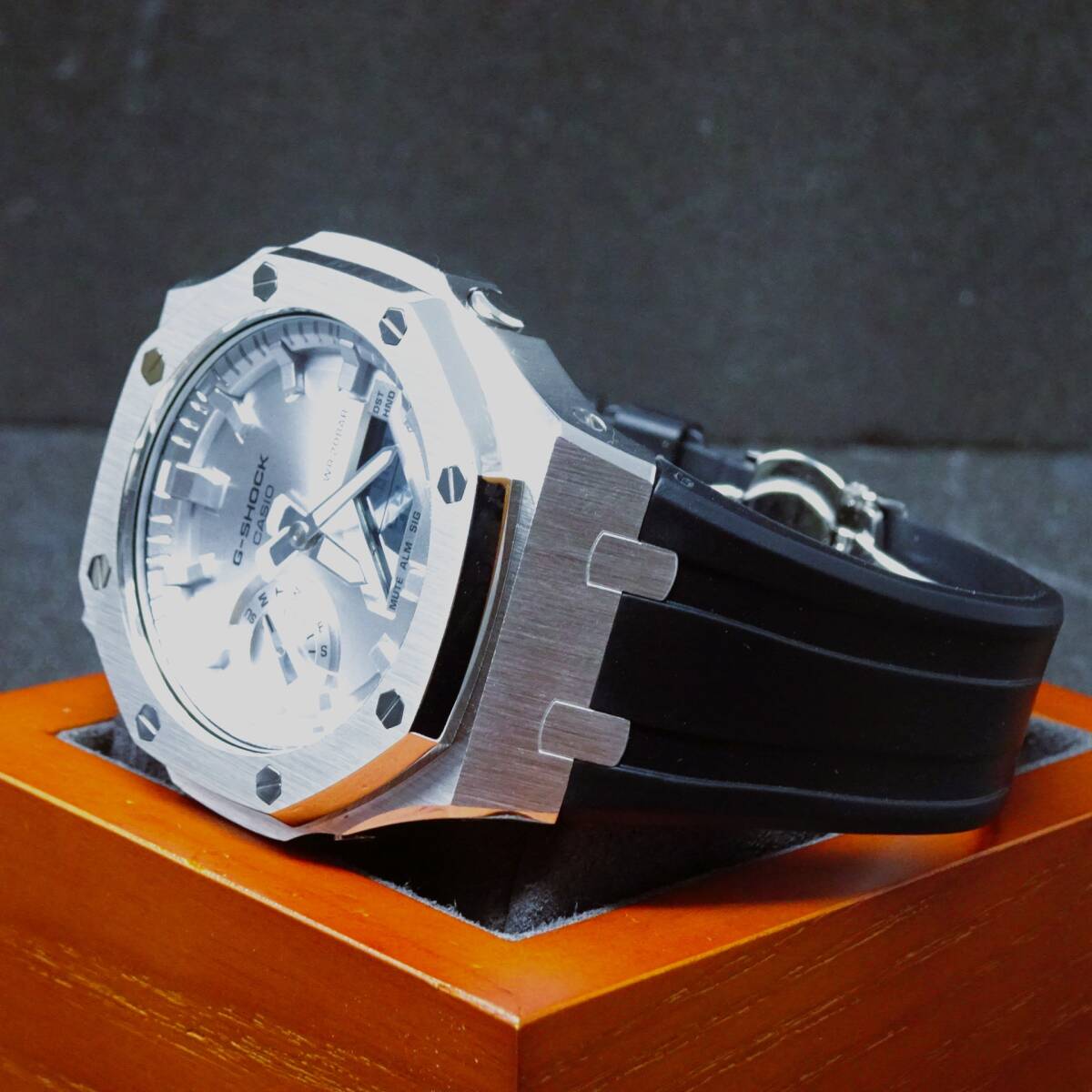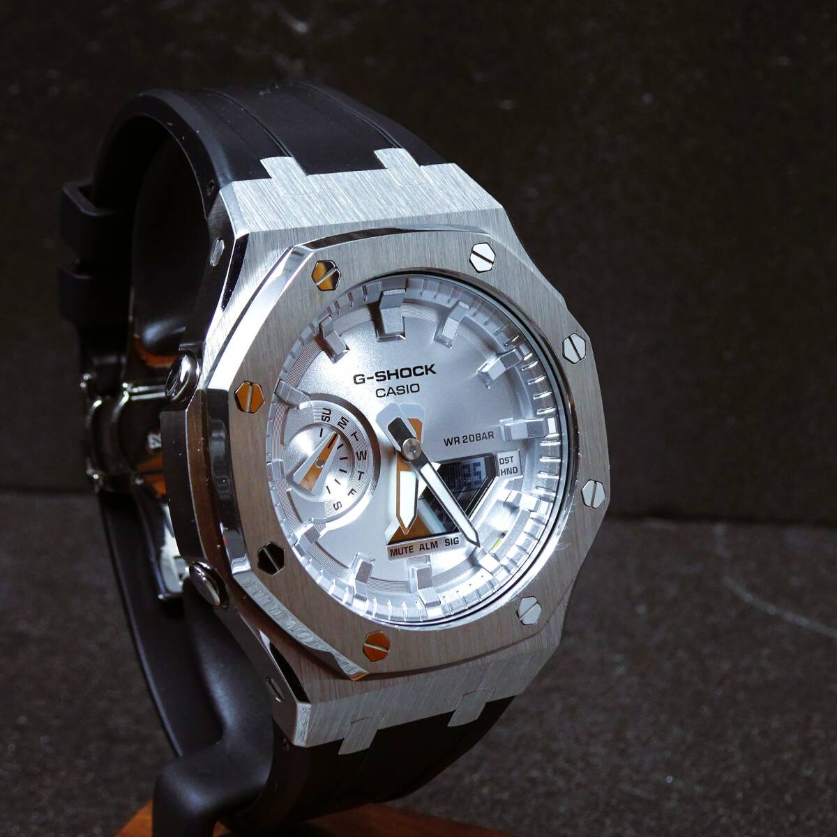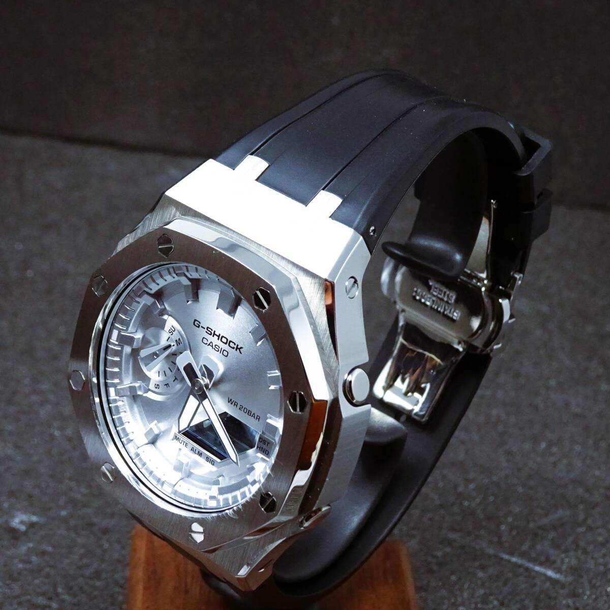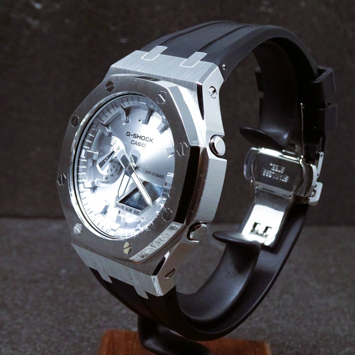 〓新品〓GショックMODカスタム〓本体付きGA2100FF〓ステンレス製シルバーベゼル&ブラックシリコンラバー腕時計〓カシオーク〓