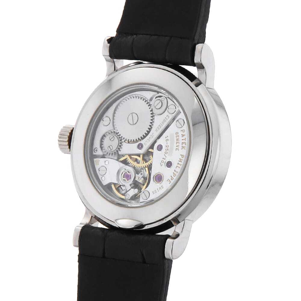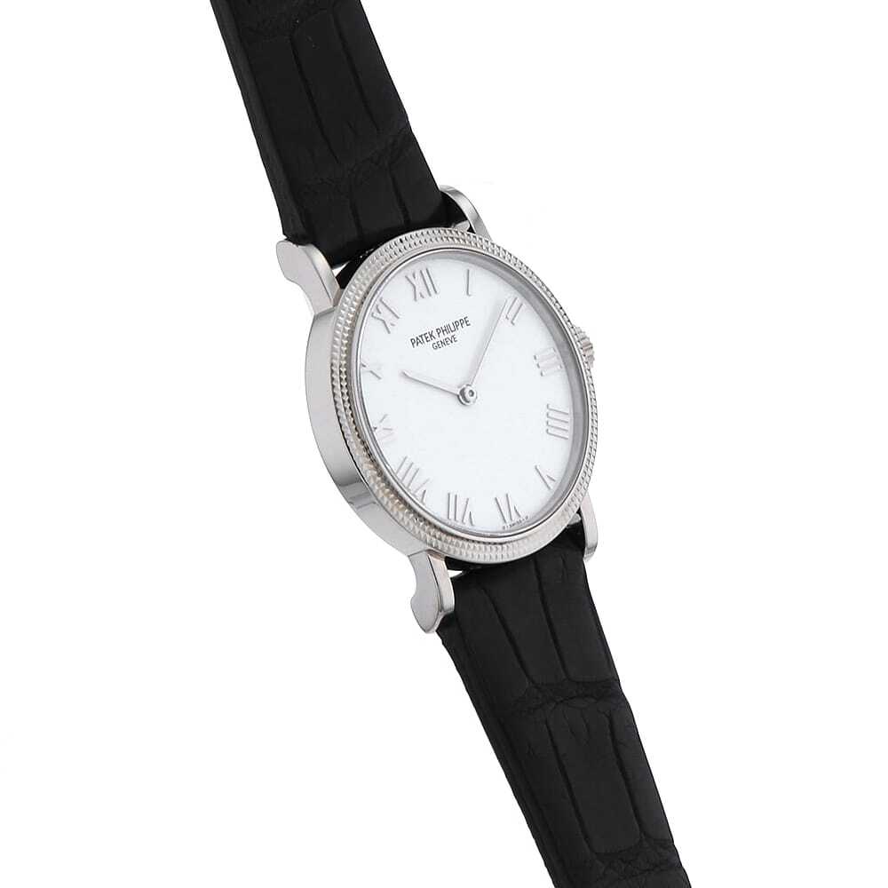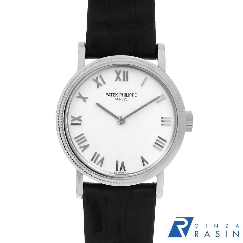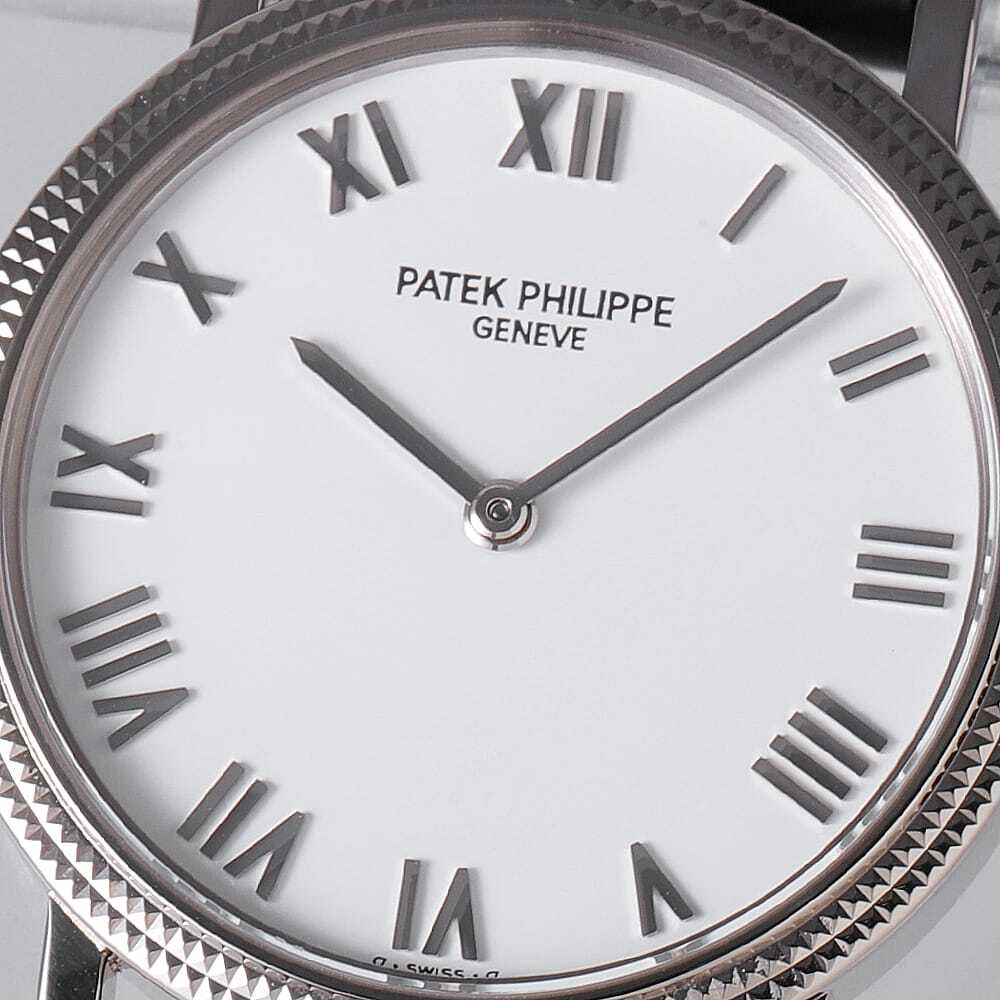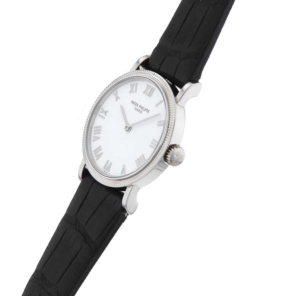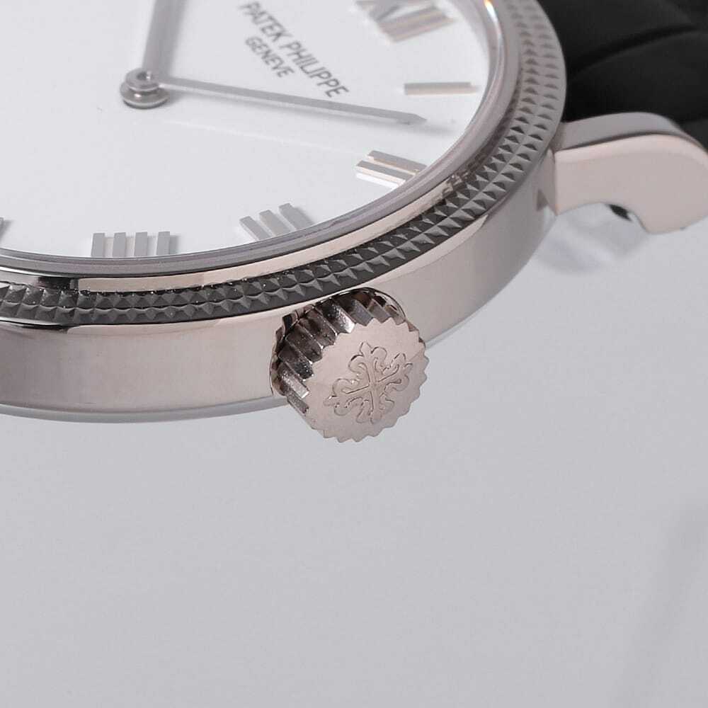 モデル情報 | パテックフィリップ永遠の定番カラトラバ。その完璧なプロポーションは丸型ウォッチの規範とされ、その後の時計界に多大な影響を与えました。こちらはホワイトゴールドケースを使用したエレガントな時計です。シンプルな2針のフェイスが、女性らしさを引き立てます。 |
