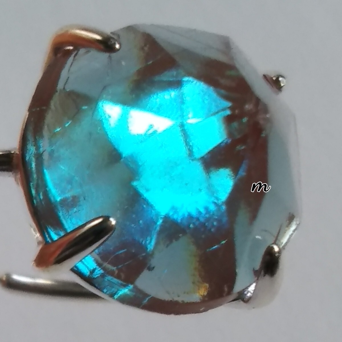 平面が多いため、特に斜め横から見た時にラウンドファセットにもカボションにもない、ブルーが青い炎のゆらめきのように立ち上がる独特の美しさを持っています。