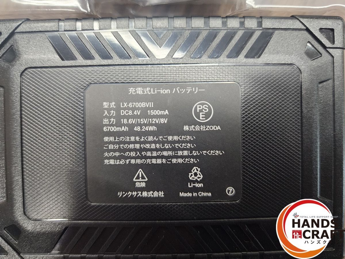 ◆仕様・・・型番LX-6700BAZ2仕様届け出業者名:株式会社ZODA 入力電圧:DC8.4V 1500mA 出力電力:18.6V/15V/12V/8V 電池容量:6700mAh 48.24Wh