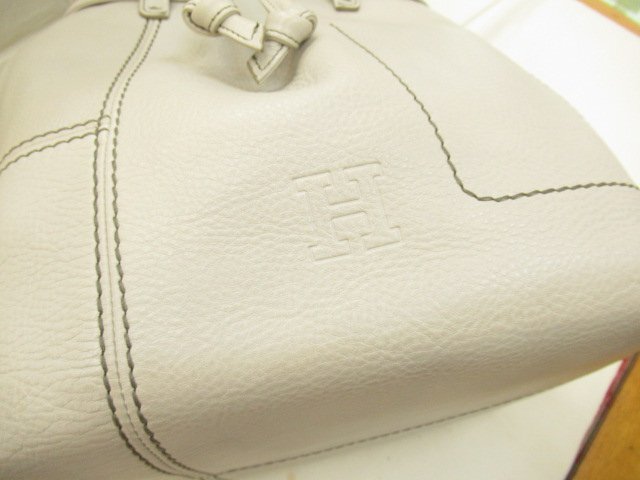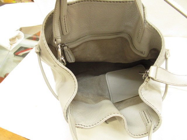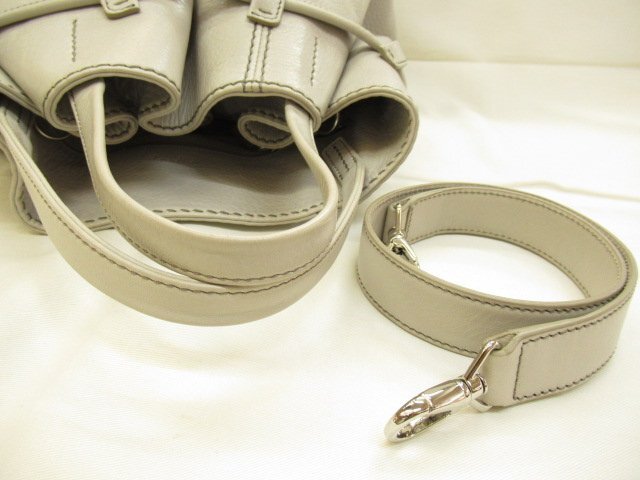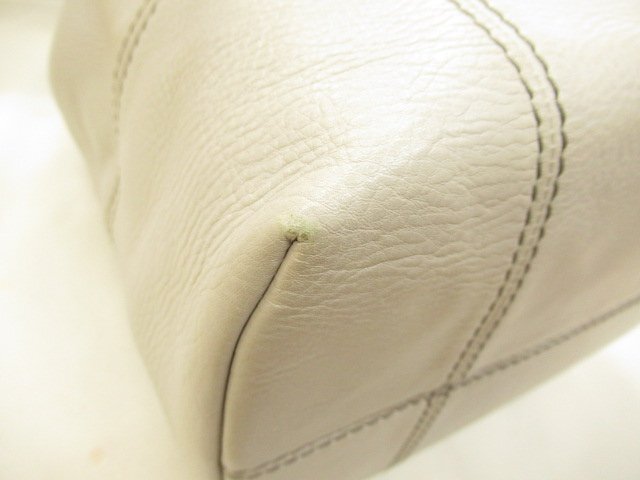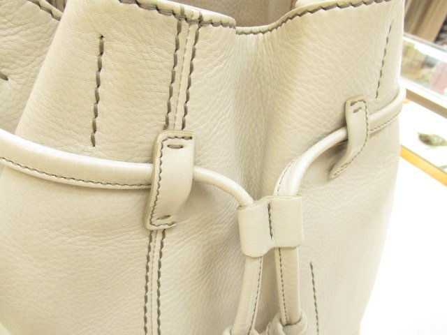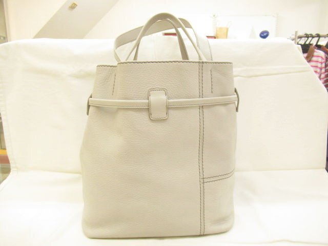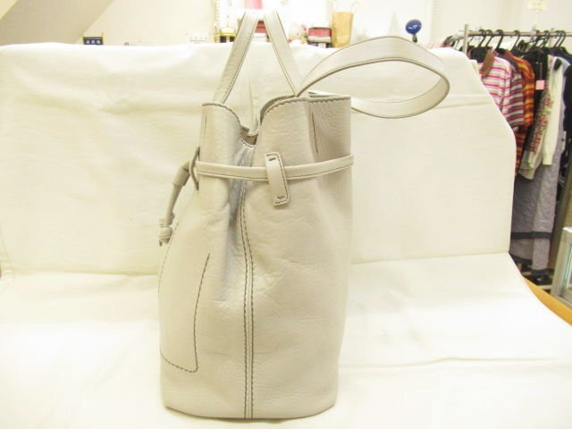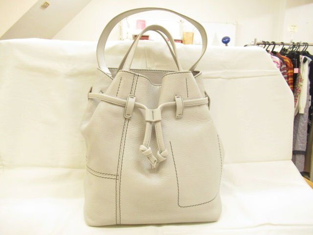 【色】 少しグレーがかったオフホワイト(画像は実物よりも青みがかって写っています) 【サイズ】 約 30×32×18 持ち手29 ショルダー:62 【素材】 革 【付属品】 なし 【参考定価】 -円 【商品説明】 取り外しのできるセミショルダー用の短いショルダーストラップが付いている、巾着紐がアクセントになっているハンドバッグです。 -------------------------------------- 【状態ランク】 外観:A 中側:A 【状態説明】 ・底の四隅のカドのうち、前側の2か所のカドに画像8のようなスレによる色落ちがあります。 ・その他はバッグ表面及び持ち手にも特に目立つ汚れや傷などもなく大変きれいです。 ・中も特に目立つような汚れはありません。 ・目立たない程度の小さな汚れ等はご了承下さい。 |