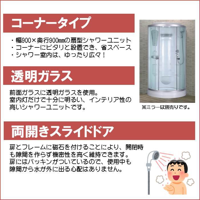 コーナータイプの扇型のシャワーユニットです。室内にゆとりがあり、ゆったりとシャワータイムを楽しむことができます。
