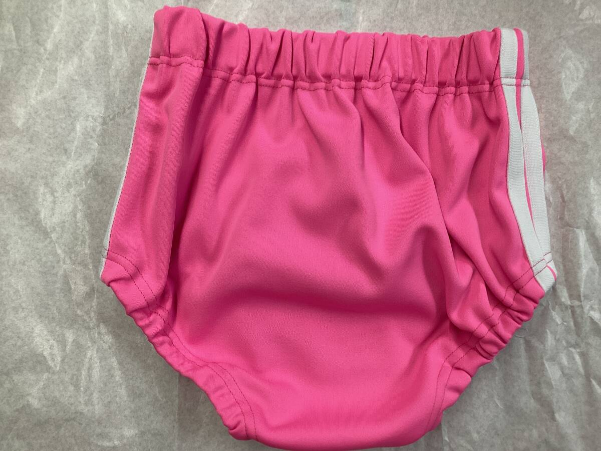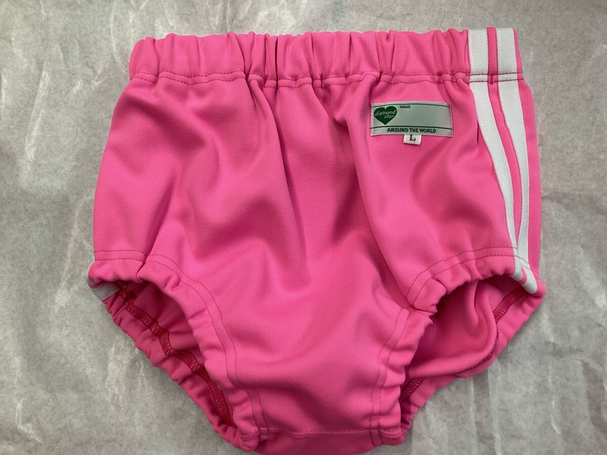 ピンクのブルマです。両サイドに白い2本線が入っています。