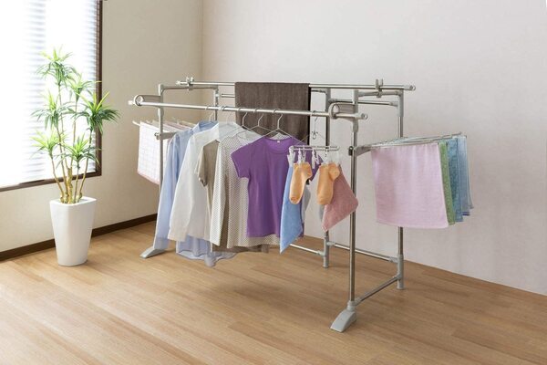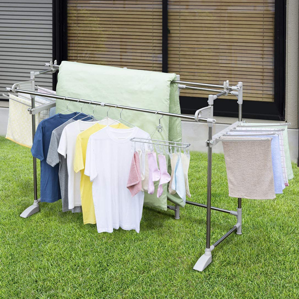 ステンレス多機能ものほし台 ほすおー 【配送料込】 コンパクトにたためる、大型の屋内・屋外用物干し ・干す量に合わせてレイアウト可能なパネル式 ・専用伸縮竿(1~1.8m)が2本付き。 ・タオルハンガー16本付き。 ・コンパクトに折りたたんで収納可能! 【使用時サイズ】 高さ約120×幅約226×奥行約74cm 【収納時サイズ】 高さ約120×幅約54×奥行約13cm カラー:ステン&グレー 商品重量(約):7.5kg 素材 【本体】 ステンレス巻スチールパイプ:φ25.4/22.2mm 【部品】 成型部品:PP樹脂・ABS樹脂 金属部品:スチール(メッキ) 注意事項 ※1.製品使用は改良のため予告なく変更することがあります。 ※2.製品の色調は、印刷のため多少実物と異なる場合があります。 ブランド 積水樹脂 |