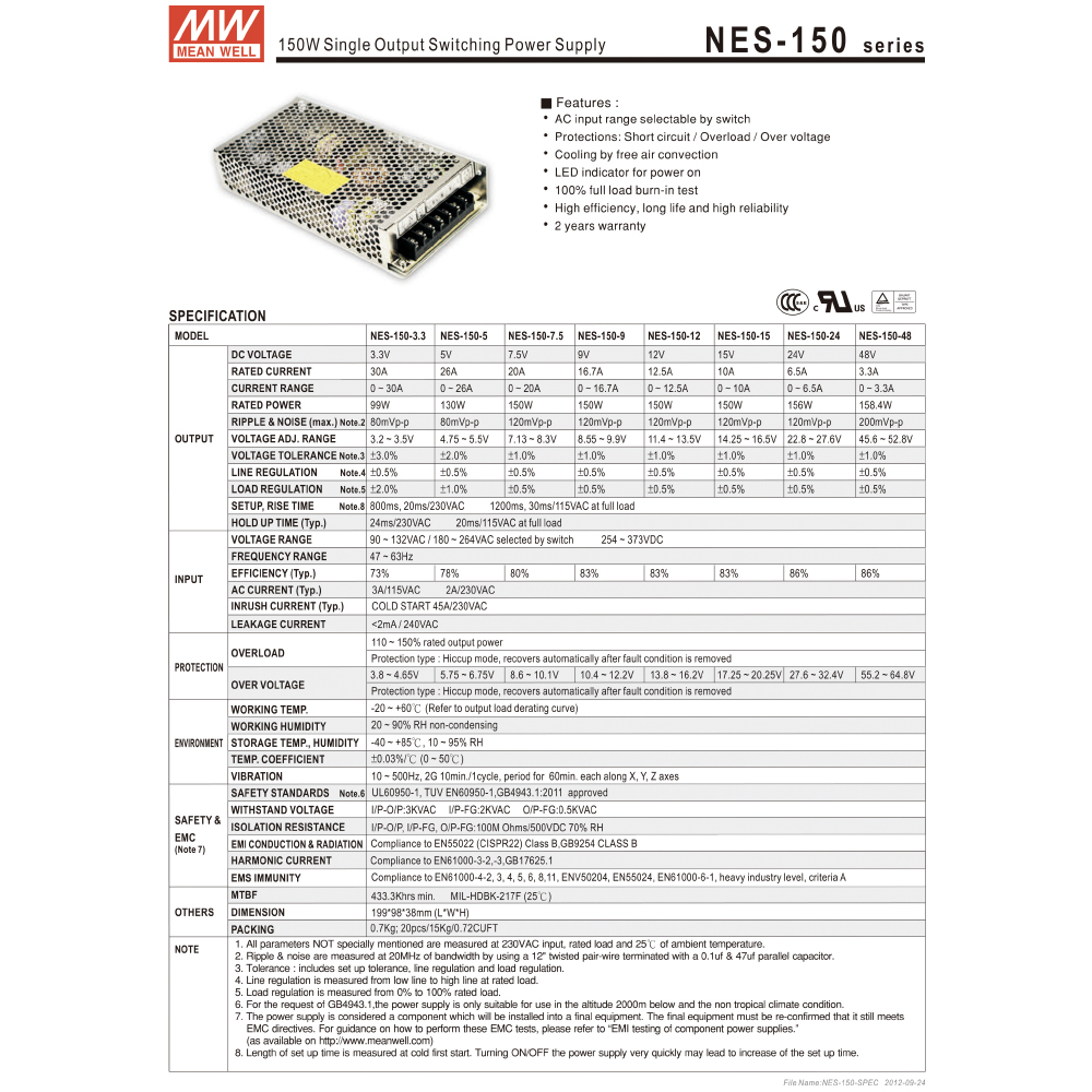 最大出力:150W    出力電圧:24V     出力電流:6.5A     入力周波数:47-63Hz