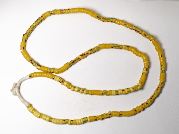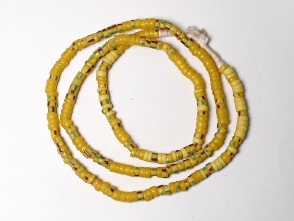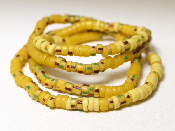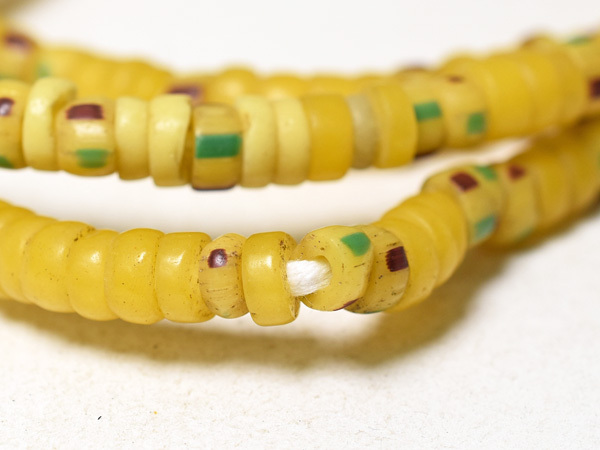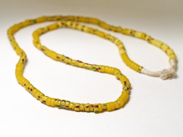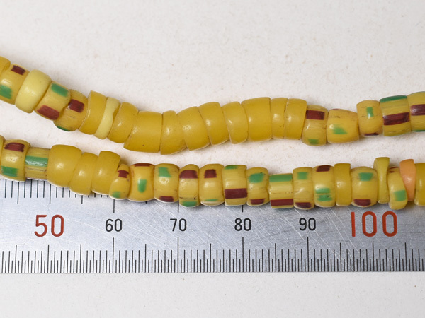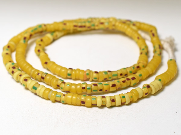 約200年前に西アフリカ向けの交易品としてヴェネチアで作られたアンティークガラスビーズミックス一連です。円盤型の縞模様のカンネッテと無地のビーズのミックスです。ハンドメイドアクセサリ等のパーツにおススメです。全長約85Cmとかなり長いので、たっぷりといろいろな用途にお使いいただけると思います。状態は概ね良好です。1本限りです。