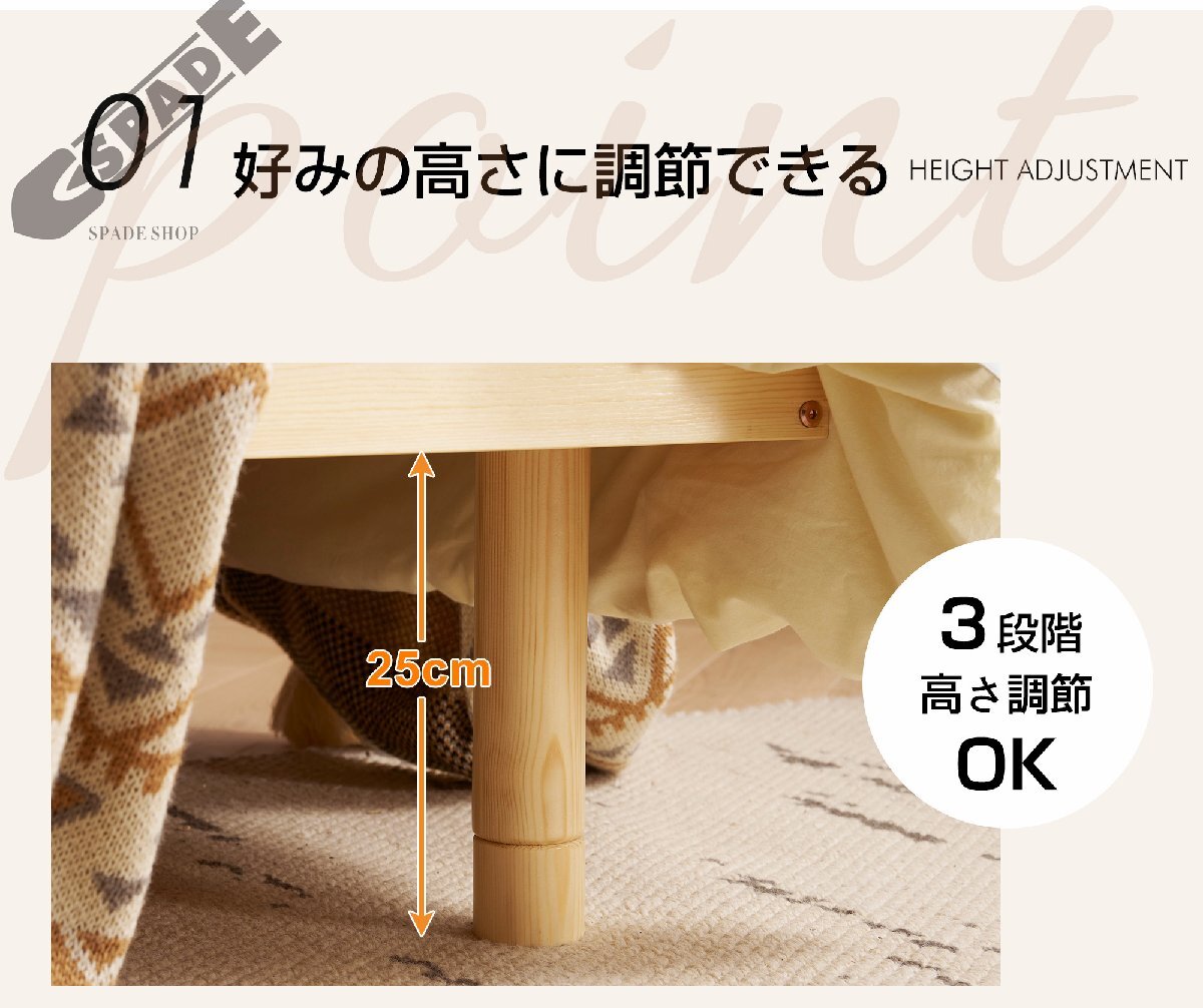 • 【好みの高さに調節できる 】独自の3段調整デザインで、ベッドの脚の高さを調節することで、3種類の高さ設定が可能です。