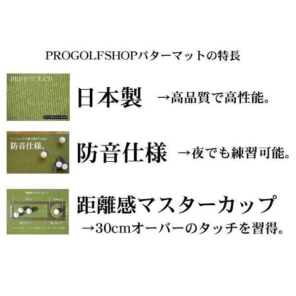 COMBOパターマットは、質感の異なる二つの高速パターマットのセットです。EXPERTパターマット。日本製のどこまでも精密で繊細な上質パターマットです。ほんの少しのタッチの違いも感じ取れる最高速パターマットとして、緩い下りにも匹敵。競技志向の上級者からも高い評価をいただいております。BENT-TOUCHパターマット。非常にきめが細かく均質です。ループ状のソフトな繊維で、弾力のある仕上がりです。沈み込まない程度の繊維でありながら、適度な弾力があり、高速ベントグリーンに似たスピードと転がり感を実現しています。付属の「距離感マスターカップ」(特許庁意匠登録認定)を使って、高速パッティングを攻略してください。