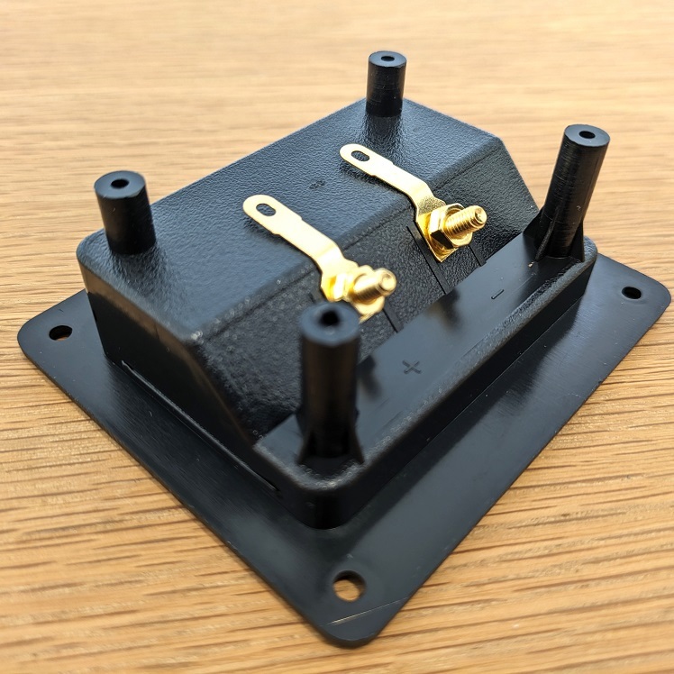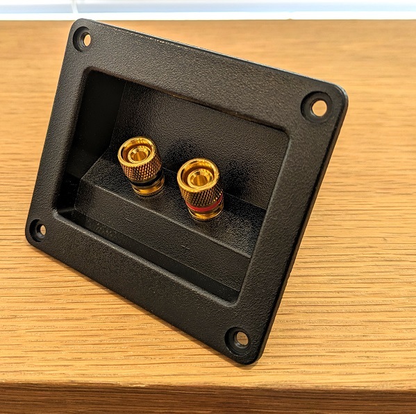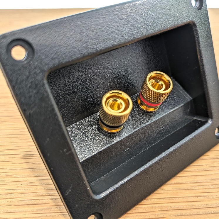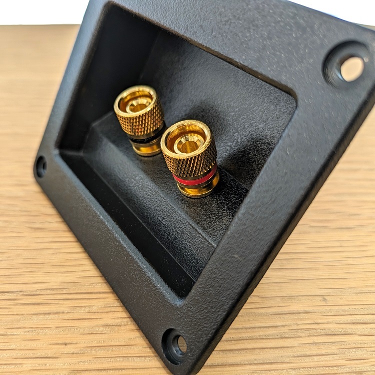 ・スピーカーターミナルボックス 埋込型 2個セット ・スピーカーボックスをつくる際や、お手持ちのスピーカーを修理する際に活用することができる、汎用埋込型タイプのスピーカーターミナルボックスセットです。 ・接続箇所の下にプラスとマイナスの印が施されていますので、接続するときにプラスとマイナスの配線を間違えてしまう心配がありません。 ・バナナプラグの接続も可能です。 ・外径 91mm×80mm ・埋込穴径 74mm×54mm | ||||