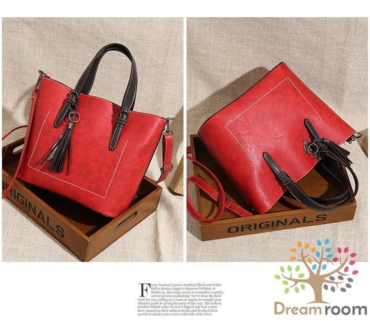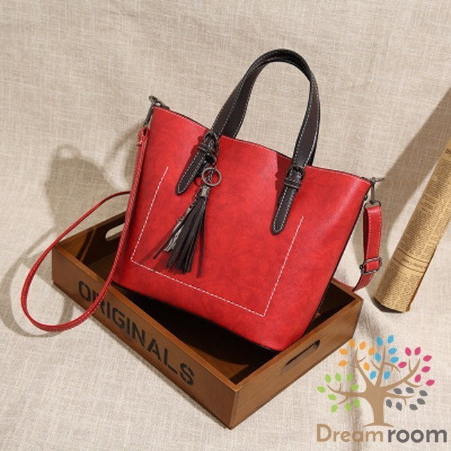1スタ☆タッセルチャーム付き ミドル レザーバケツトートBAG【レッド】 ハンドバッグ ショルダーバッグ セレブ 合皮革 K-095-1