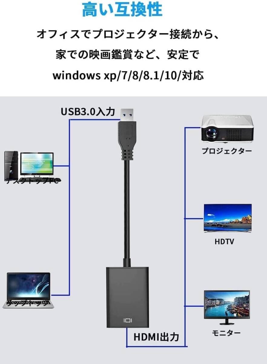 • ★幅広く対応:本usb hdmiはWindowsに対応、可能お使いのコンピュータにUSB ポート経由でHDMIディスプレイを追加します。MacOS、Vista、Linuxは非対応で、Windows XP/7以降のシステムに対応しております。(macbookなどのノートパソコンを使用する場合はDC電源を接続してください)