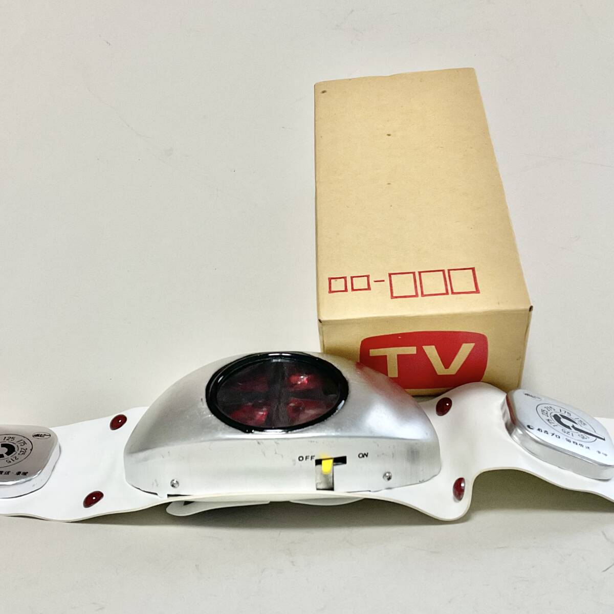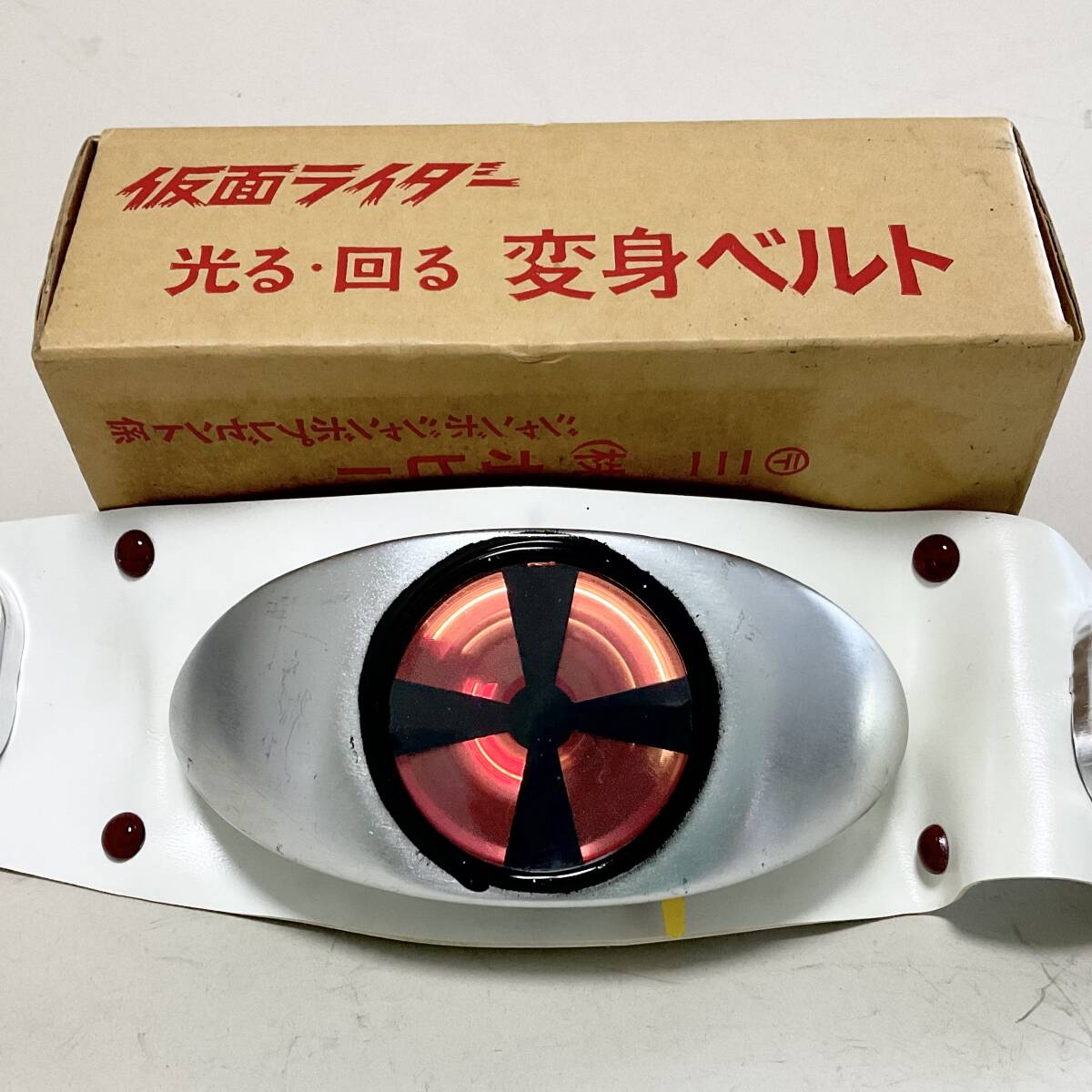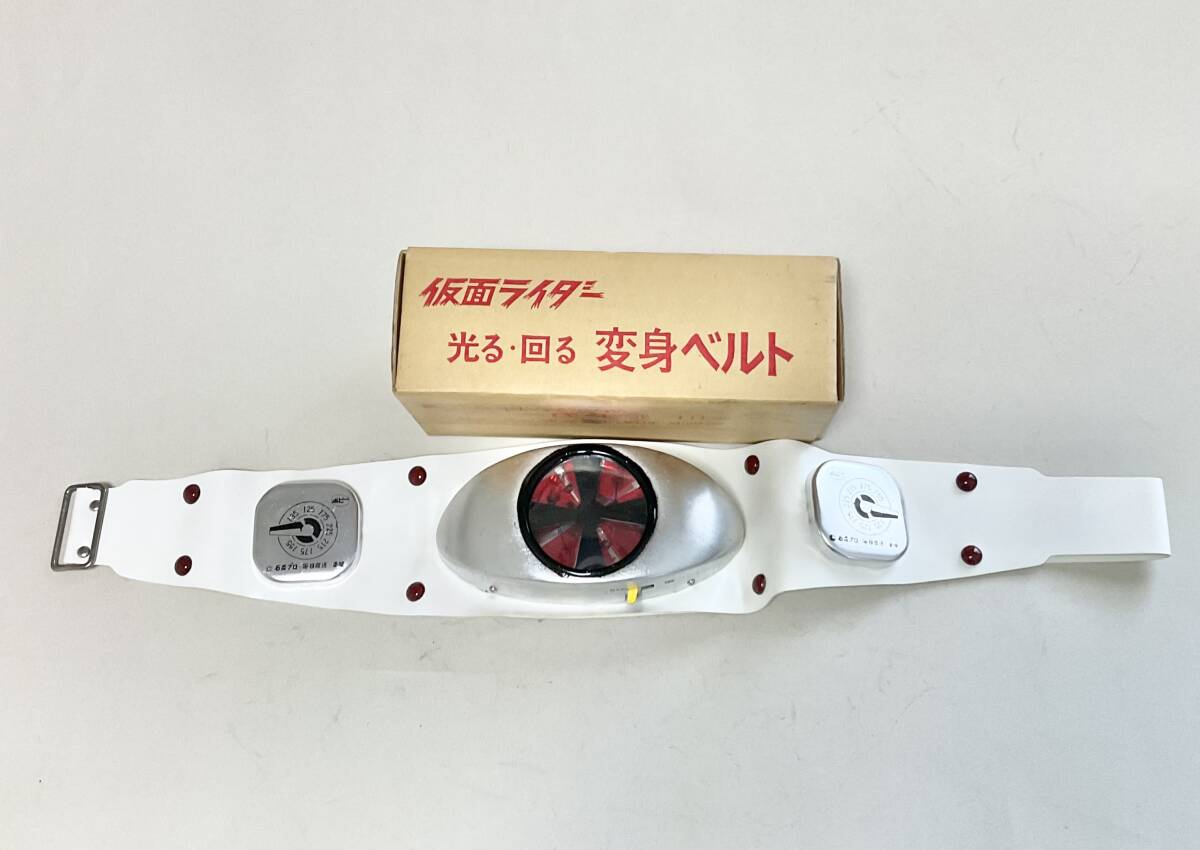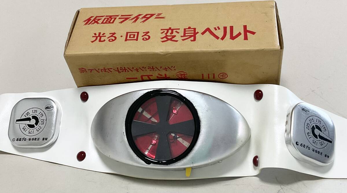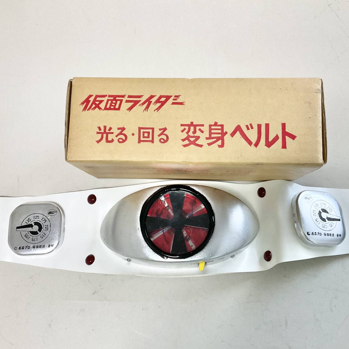 *1970年代、当時ものポピーの仮面ライダーの電動変身ベルトです。単3電池2本でスイッチONで綺麗に点灯して回転します。ポピーのジャンボジャンボプレゼント品です。サイズは全長約720㎜、本体バックル部分は約150㎜です。本体と箱は小汚れありますが約50年前の品物としては綺麗です。懸賞品 当選品 非売品です。この機会に是非…………!