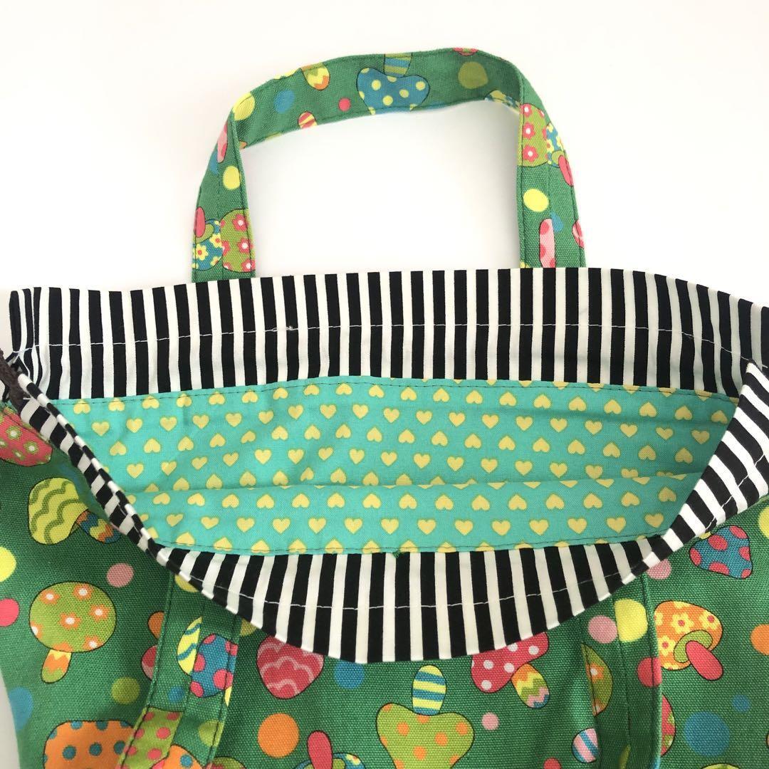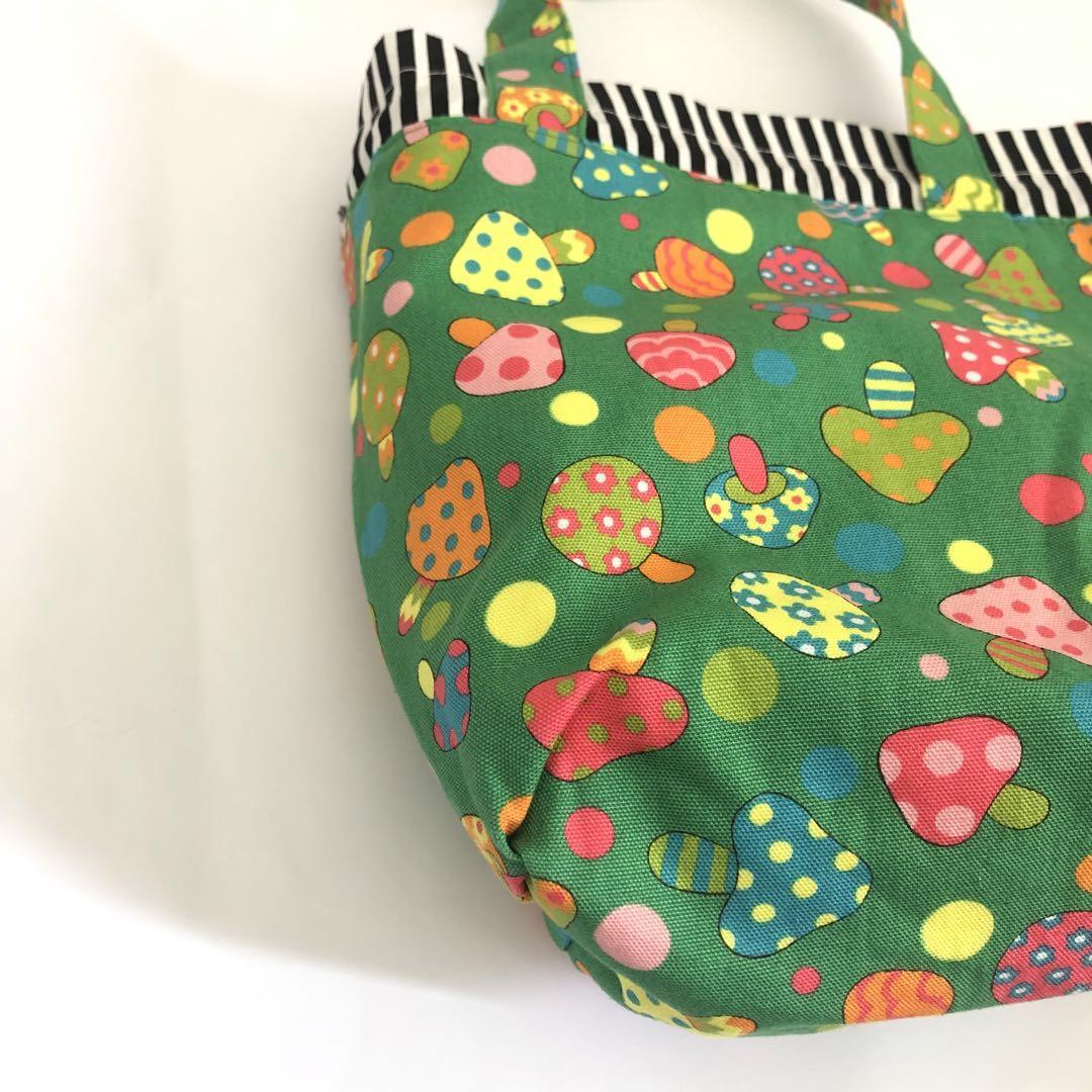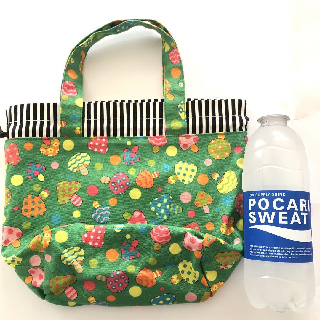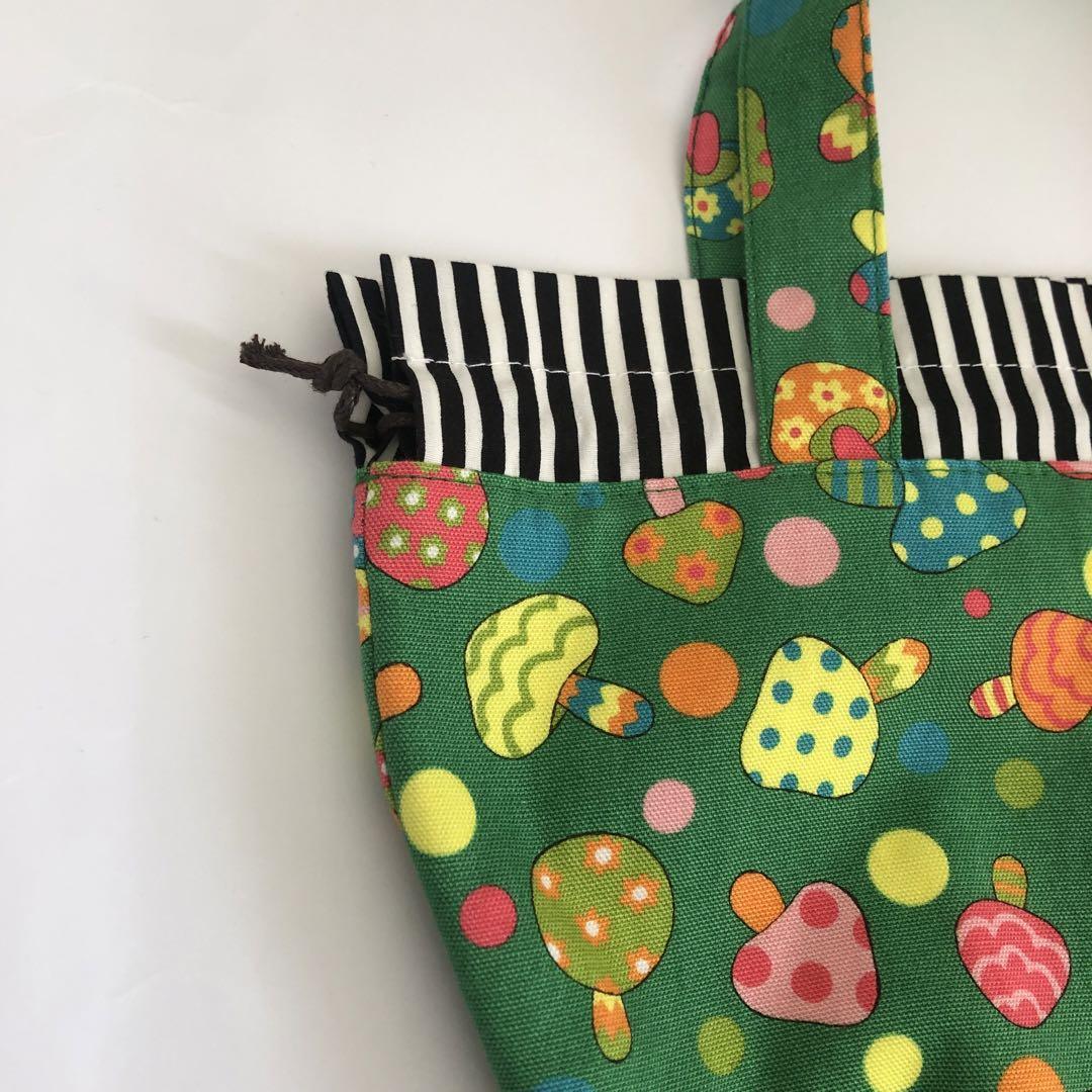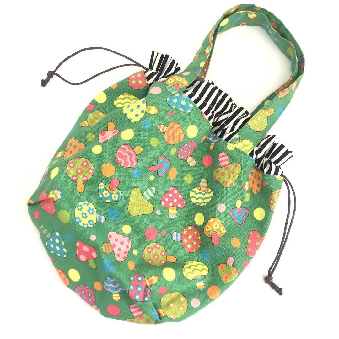 ハンドメイド カラフルきのこ柄 持ち手付き巾着バッグ 赤 ミニバッグ エコバッグ