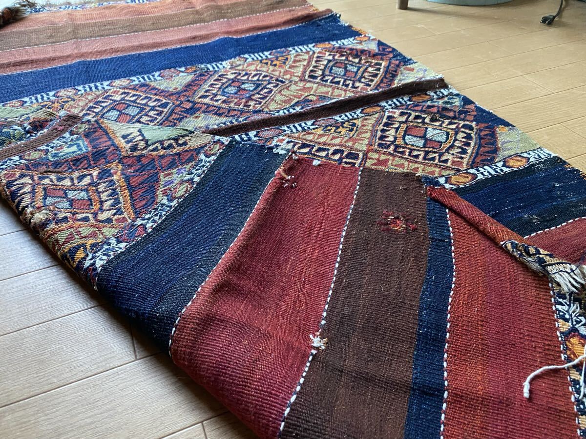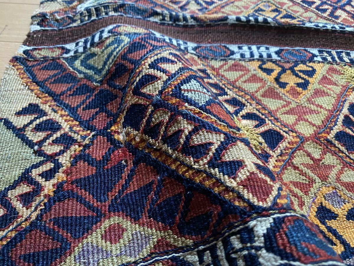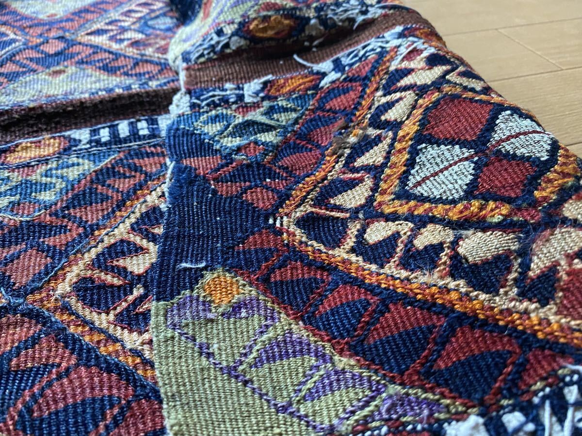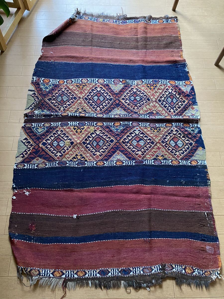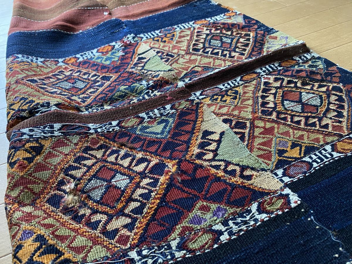 100年以上のアンティーク故、傷みや裂けはありますので画像でご覧になってご判断下さい。 フラグメントですが状態はよくキリムと言うよりは古布。 120年くらい前に織られて 使い込まれている とろーりとした シムたっぷりの これぞアンティーク!