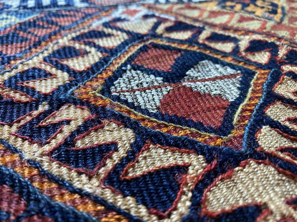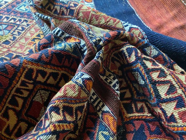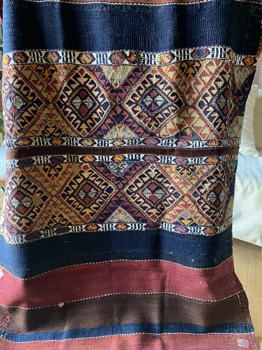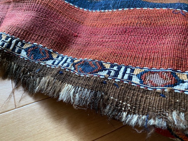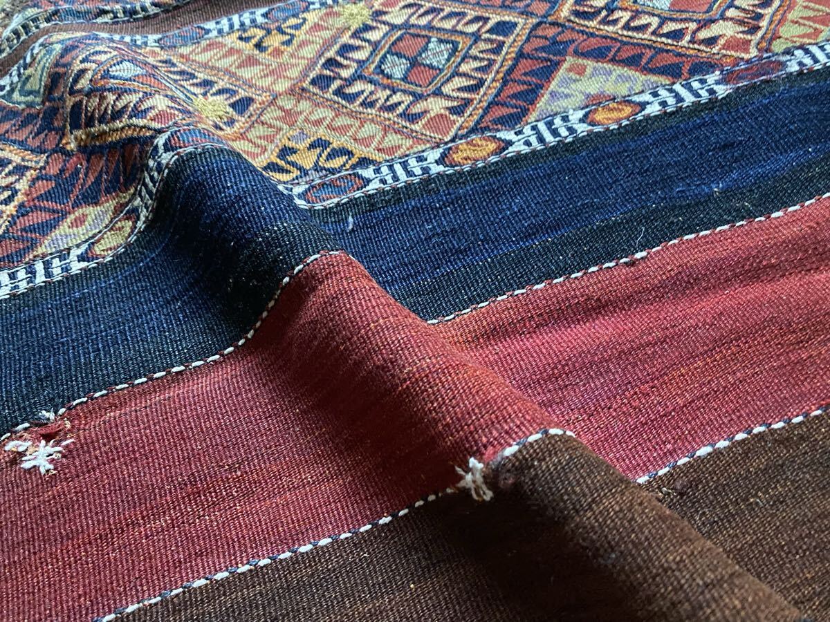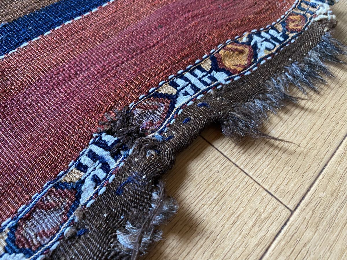 100年以上のアンティーク故、傷みや裂けはありますので画像でご覧になってご判断下さい。 フラグメントですが状態はよくキリムと言うよりは古布。 120年くらい前に織られて 使い込まれている とろーりとした シムたっぷりの これぞアンティーク!