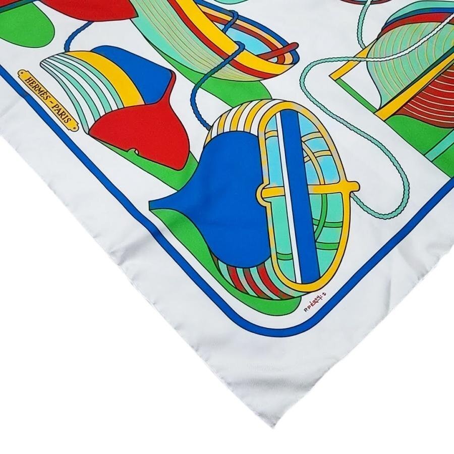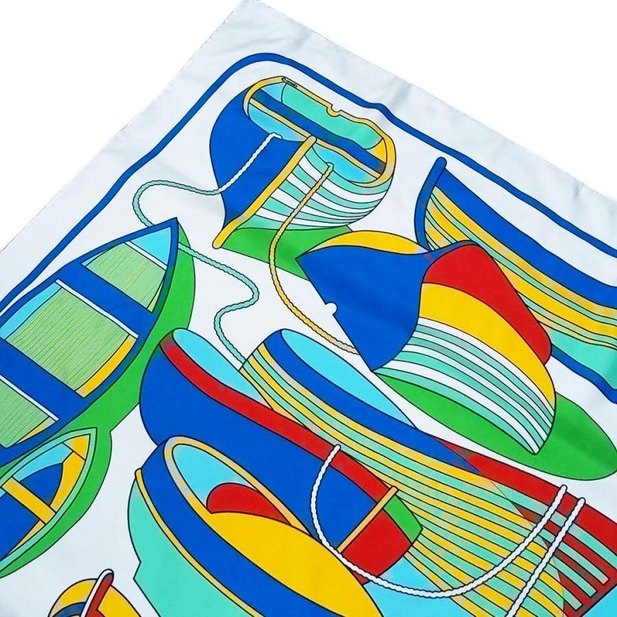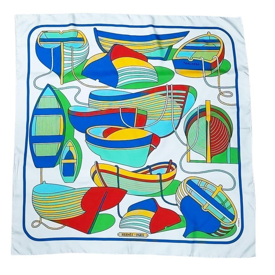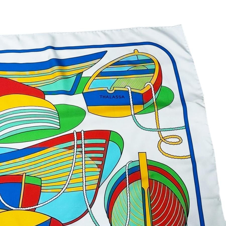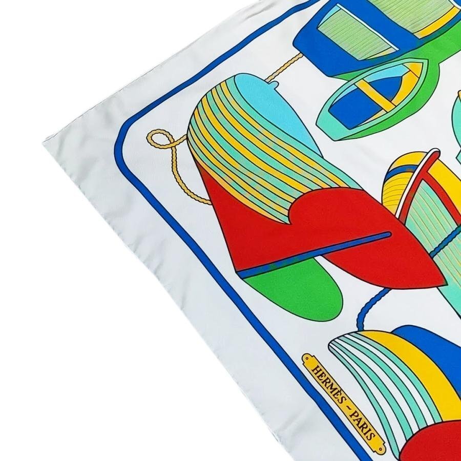 ・送料無料 美品 エルメス HERMES スカーフ カレ90 大判 ショール THALASSA ボート柄 絹 シルク100% 仏製 フランス製 白 ホワイト系 レディース