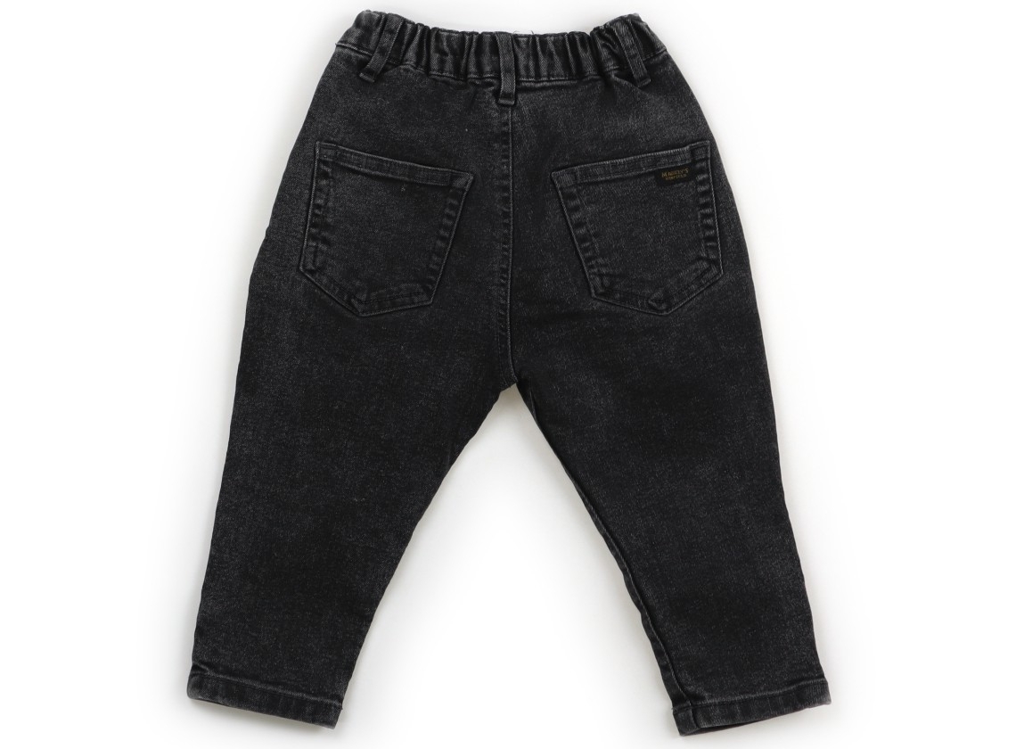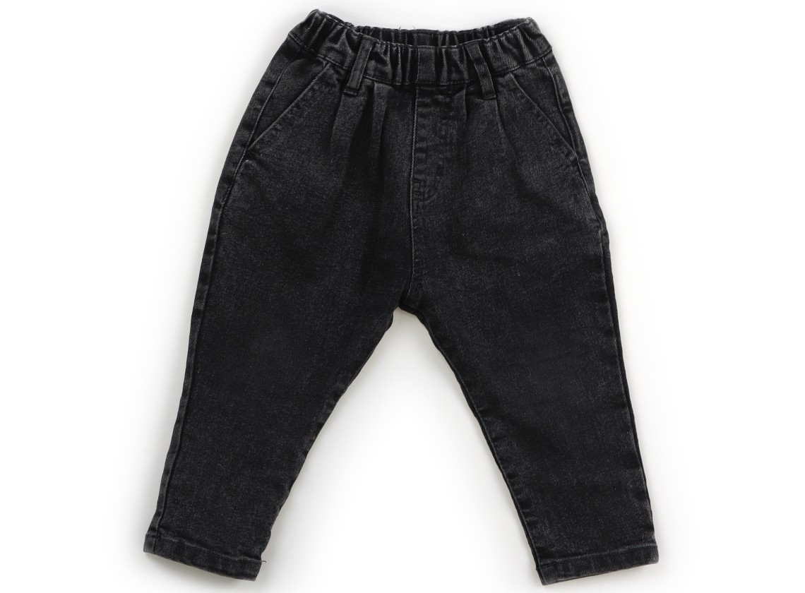 ブラックデニム。コットン、ポリエステル、レーヨン素材。ウエストは総ゴム、交換穴あり。元々フェードしている色です。使用感はありますが、目立った汚れはありません。