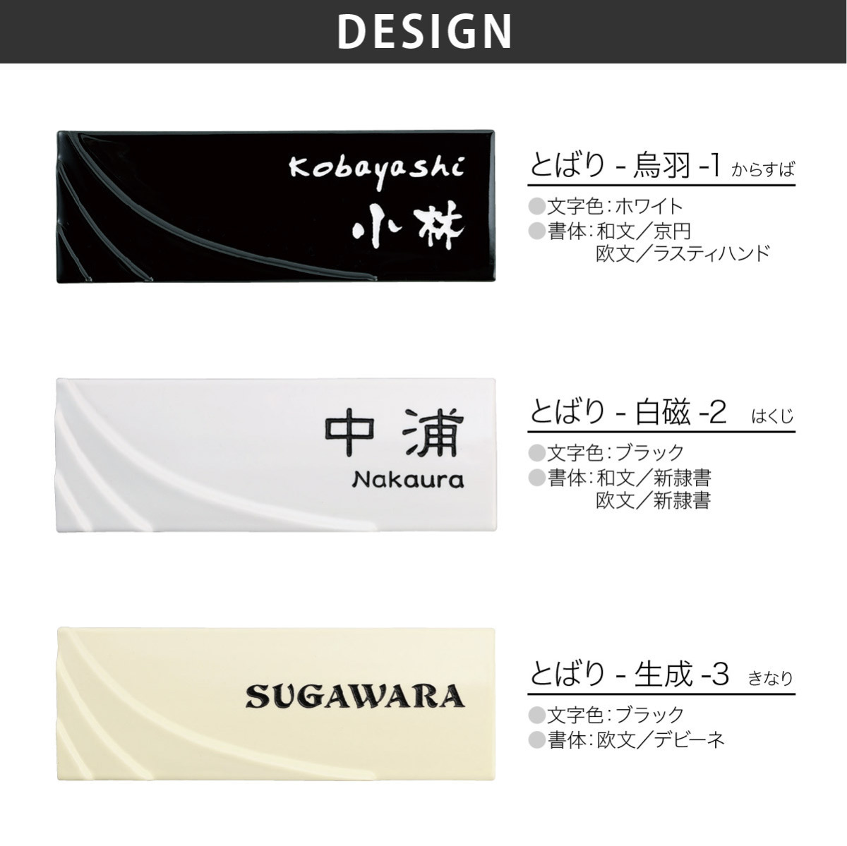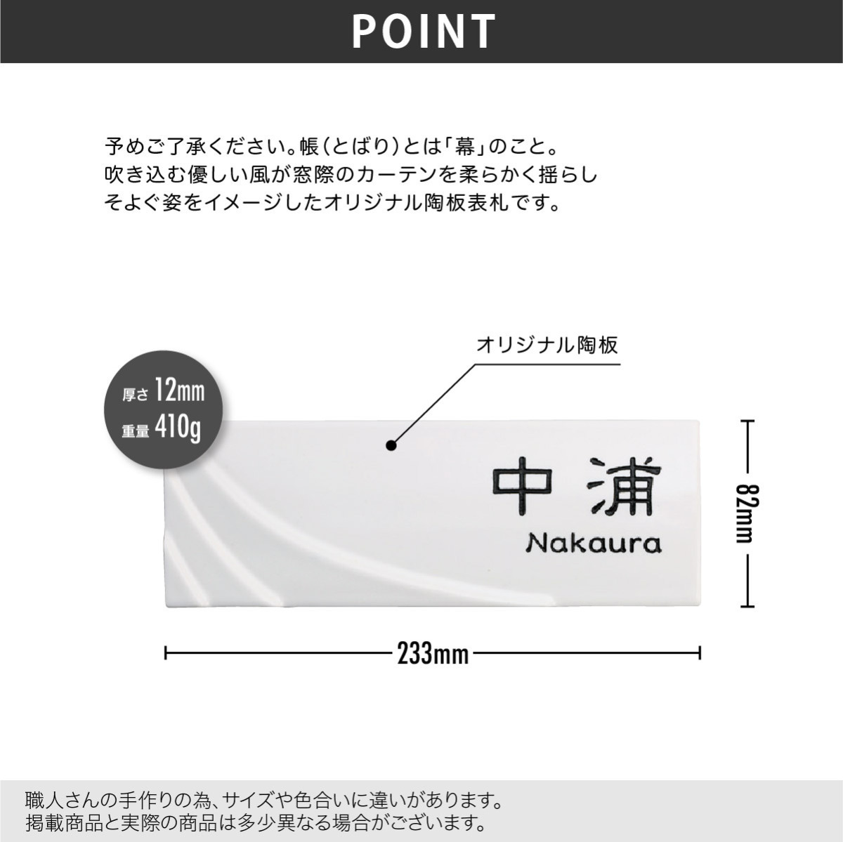 | 商品詳細 | 帳(とばり)とは「幕」のこと。吹き込む優しい風が窓際のカーテンを柔らかく揺らしそよぐ姿をイメージしたオリジナル陶板表札です。 |