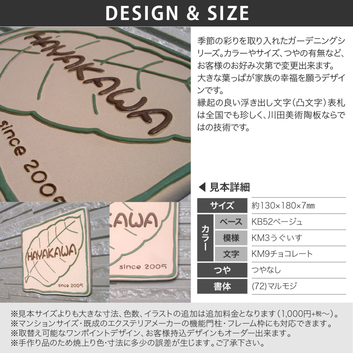 商品詳細 | 季節の彩りを取り入れたガーデニングシリーズ。カラーやサイズ、つやの有無など、お客様のお好み次第で変更出来ます。大きな葉っぱが家族の幸福を願うデザインです。縁起の良い浮き出し文字(凸文字)表札は全国でも珍しく、川田美術陶板ならではの技術です。 |