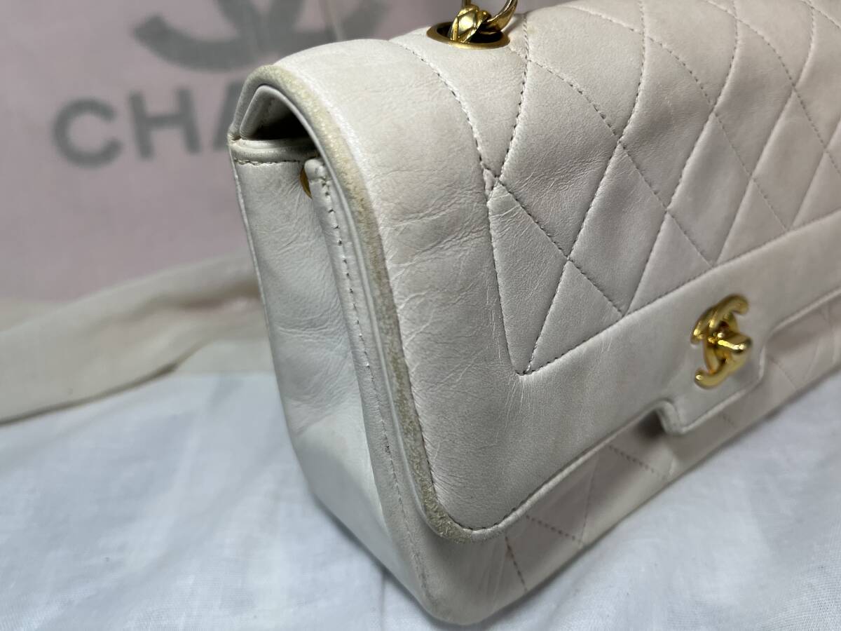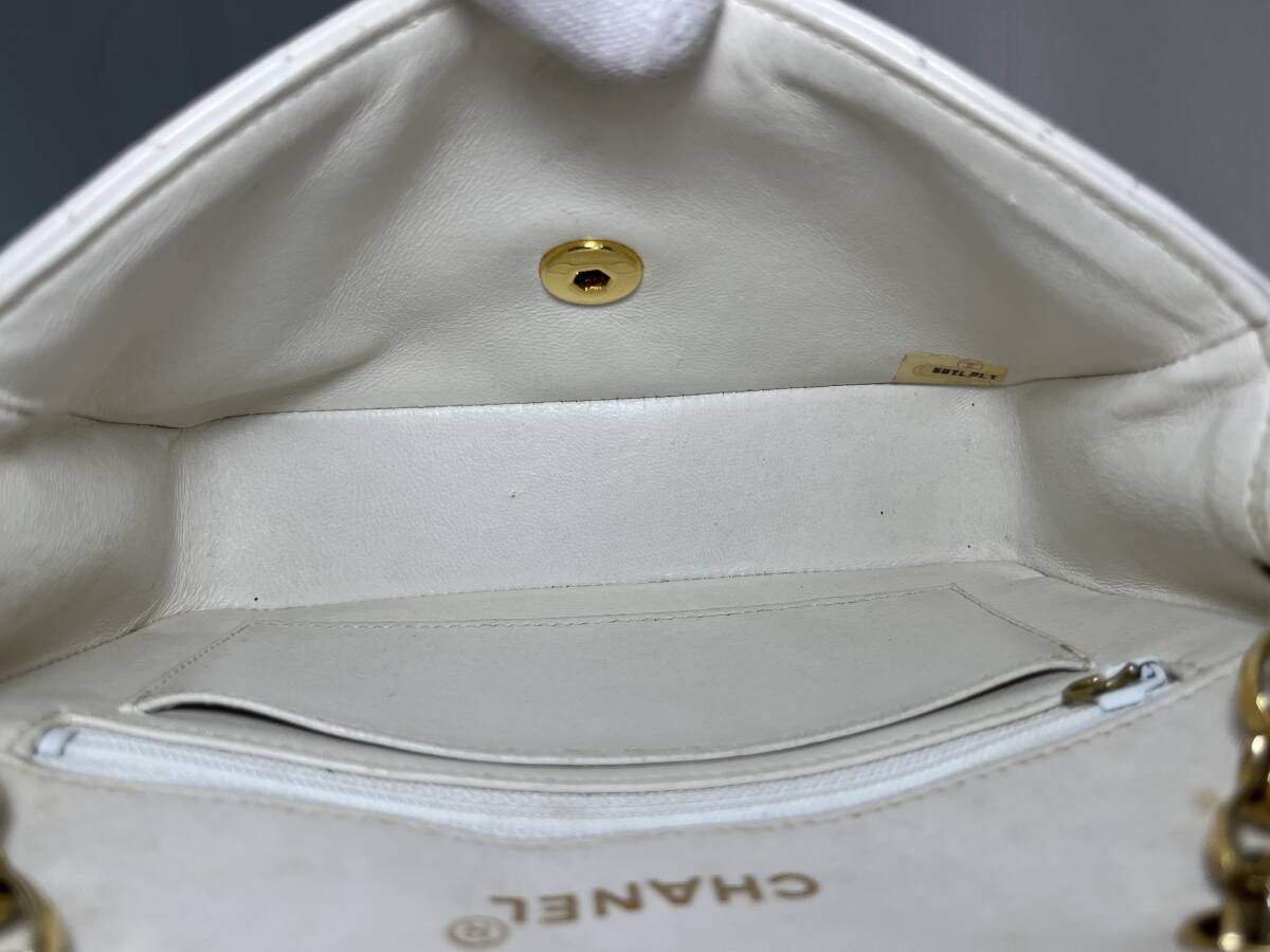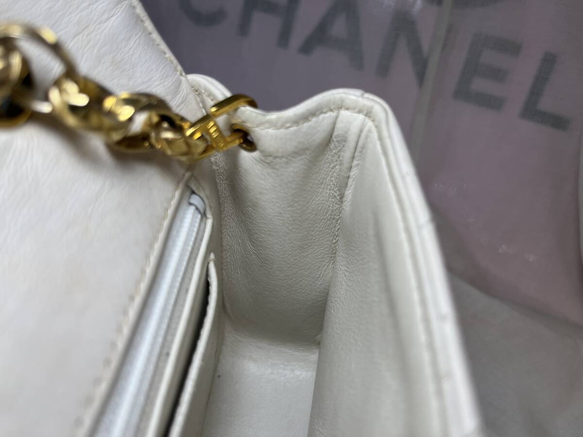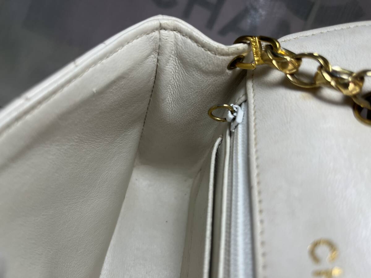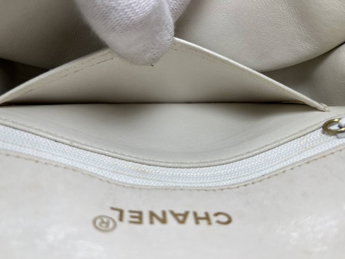 フラップの縁や上部、バッグ底、角部分に擦れや小傷あり。補色処理は施されていないため、ところどころに黒ずみやくすみが残る状態ですが、白レザー特有の深みある風合いを感じられます。
