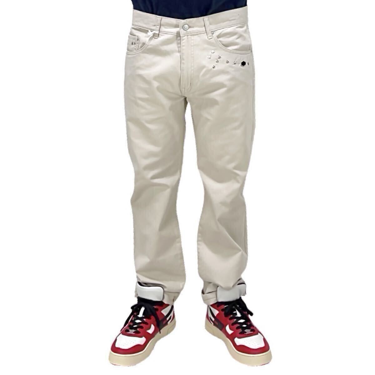 フロントポケット周りのスタッズが特徴のパンクテイストながらも、カラーリングやシルエットでスタイリッシュな印象の5ポケットパンツ。