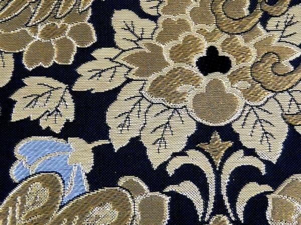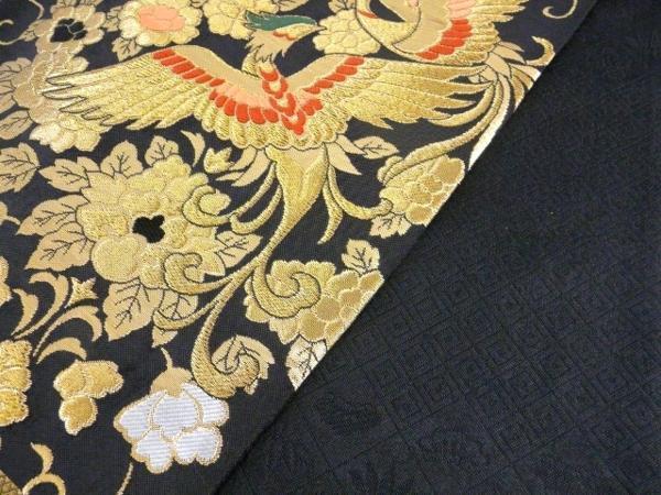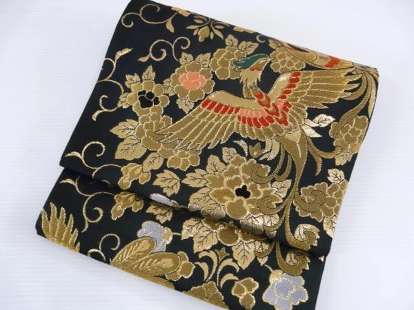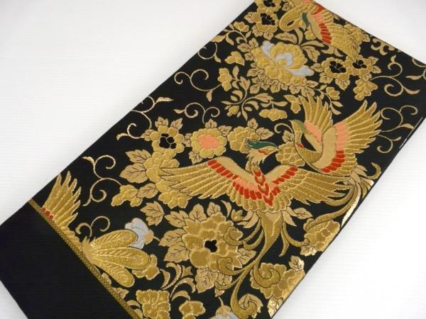 053 新品 洗える袋帯 全通 二重太鼓 黒地に金 鳳凰 未仕立て