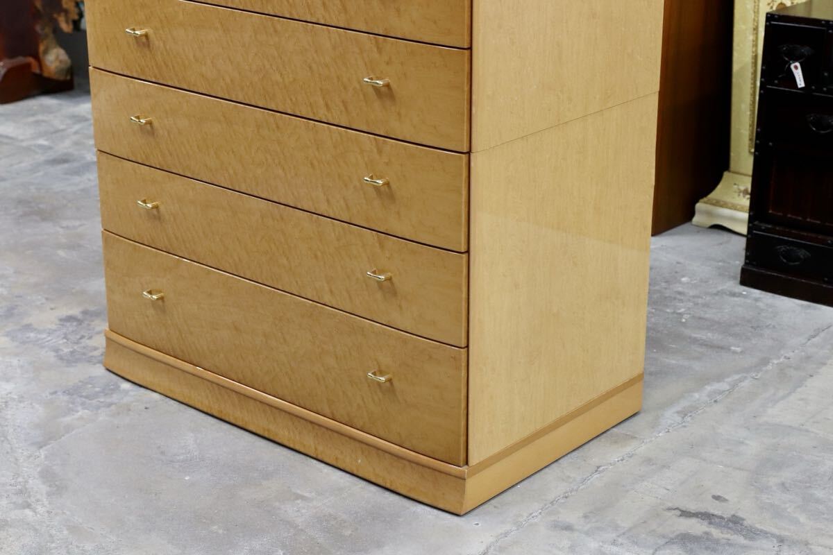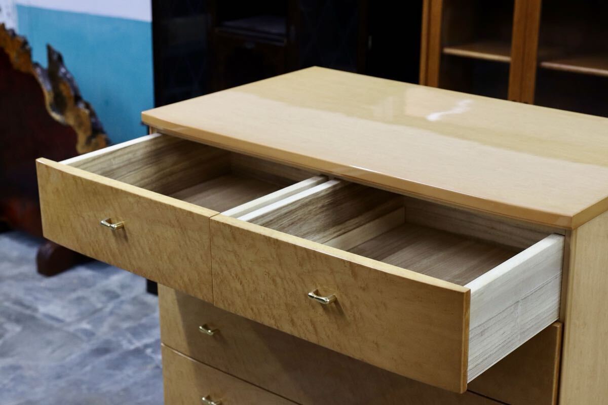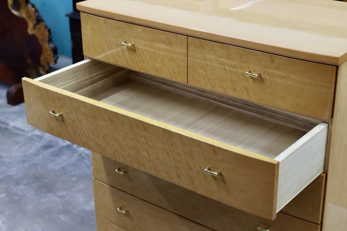 バーズアイメープルはハードメープルの中にごく稀に発生するもので、表面近くの1/5のみでしかとれない大変貴重な材で、丸い玉のような模様が連なったり、渦巻状になって現われる杢目で、鳥の目に似た模様が集まっているところから“鳥目杢”(とりめもく)と呼ばれています。神秘的な木目と衝撃に強く割れにくい性質から高級家具や高級車の内装材として使用されています。